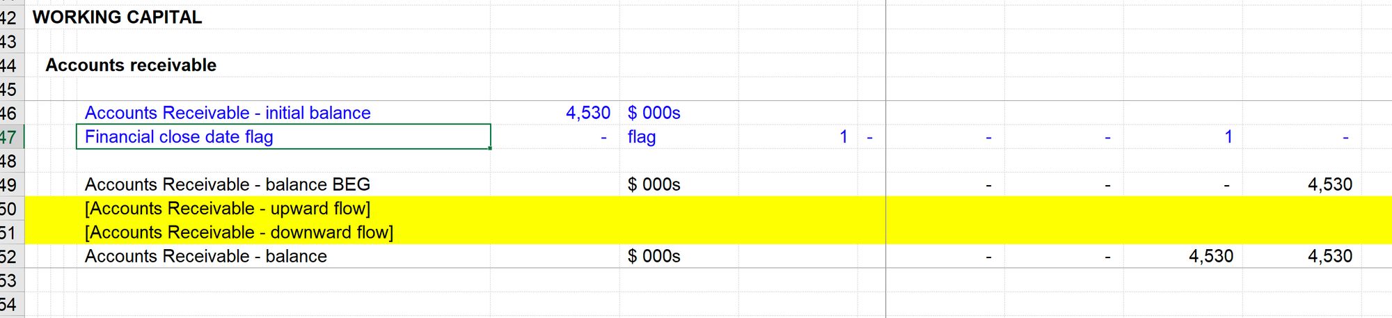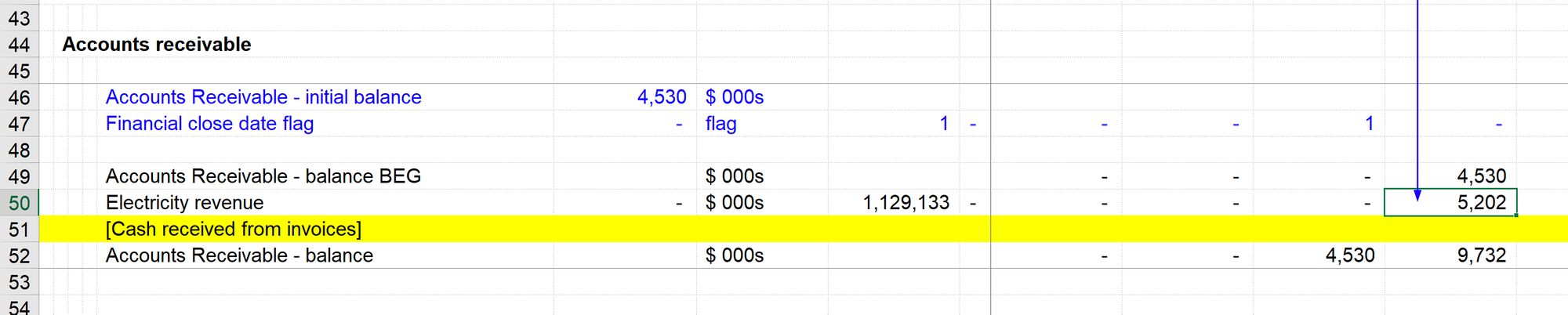 Each balance that you model will have its own flows that are relevant. In the case of Accounts receivable, the upward flow would be the issuance of invoices, which we have modelled as Electricity revenue. The download flow would be the cash received when these invoices are paid.