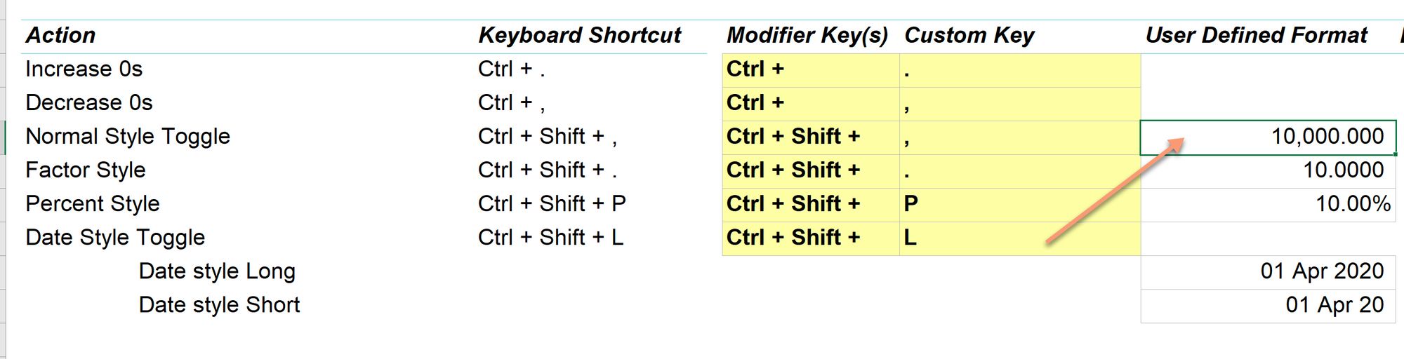 In the Custom Shortcut sheet, you can define the styles you wish to apply. For example, if the standard monetary unit in your model was millions of dollars, you may want to show three decimals by default.
