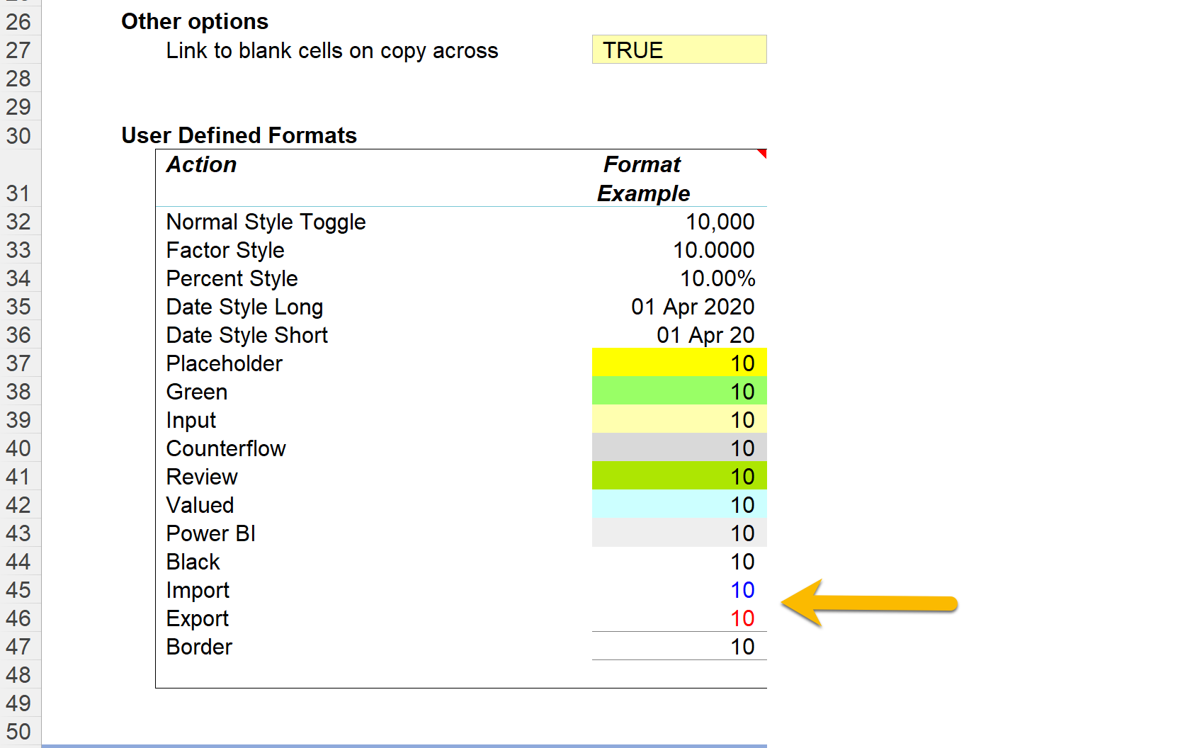 Note that you can change any of the formats in the User Defined Formats section of the settings and your selected formats will be applied by the relevant format macros.
