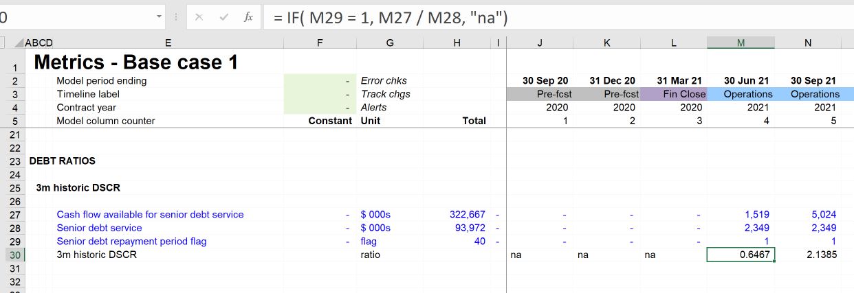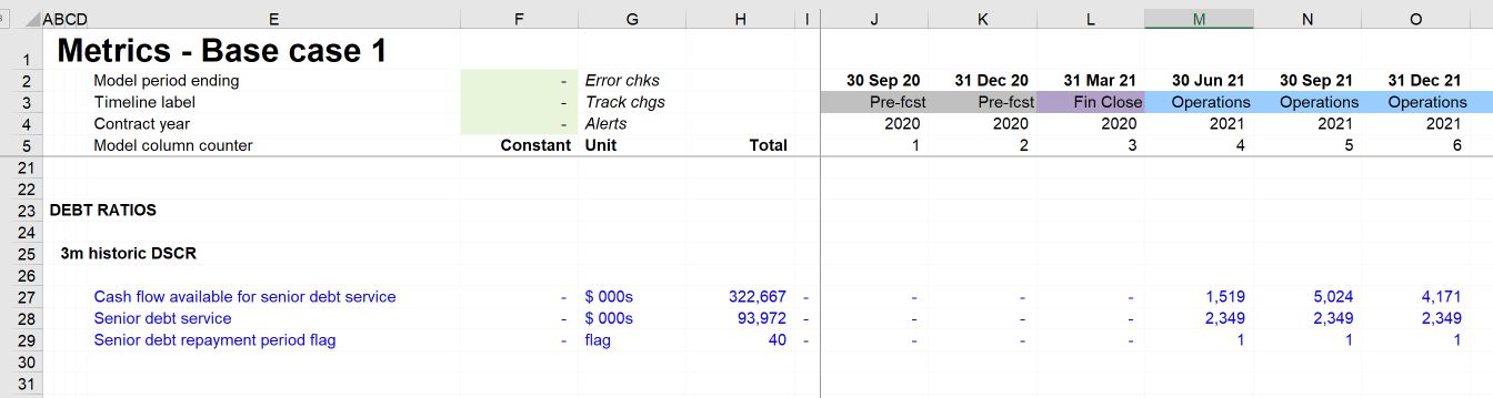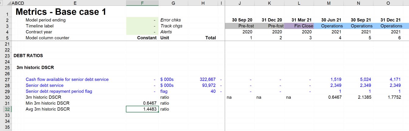 We can see that the ratio falls below 1 in multiple periods. This means that the business does not have sufficient cash to pay debt in these periods. This is not a base case that project sponsors could present to lenders.