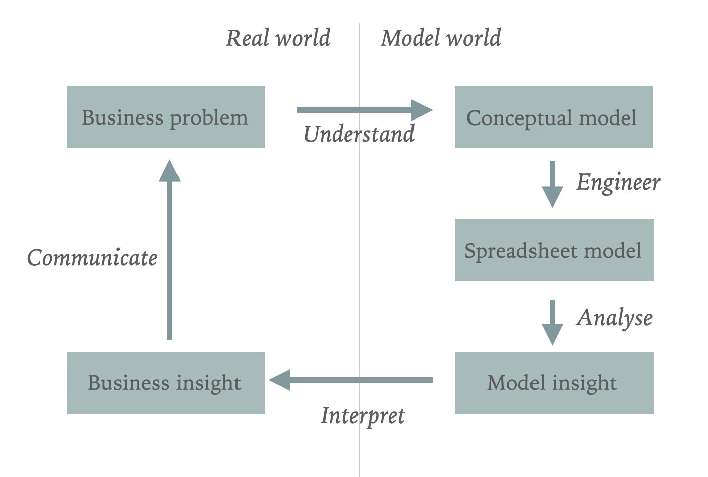 This framework splits the world into two parts; the real world and the model world.
