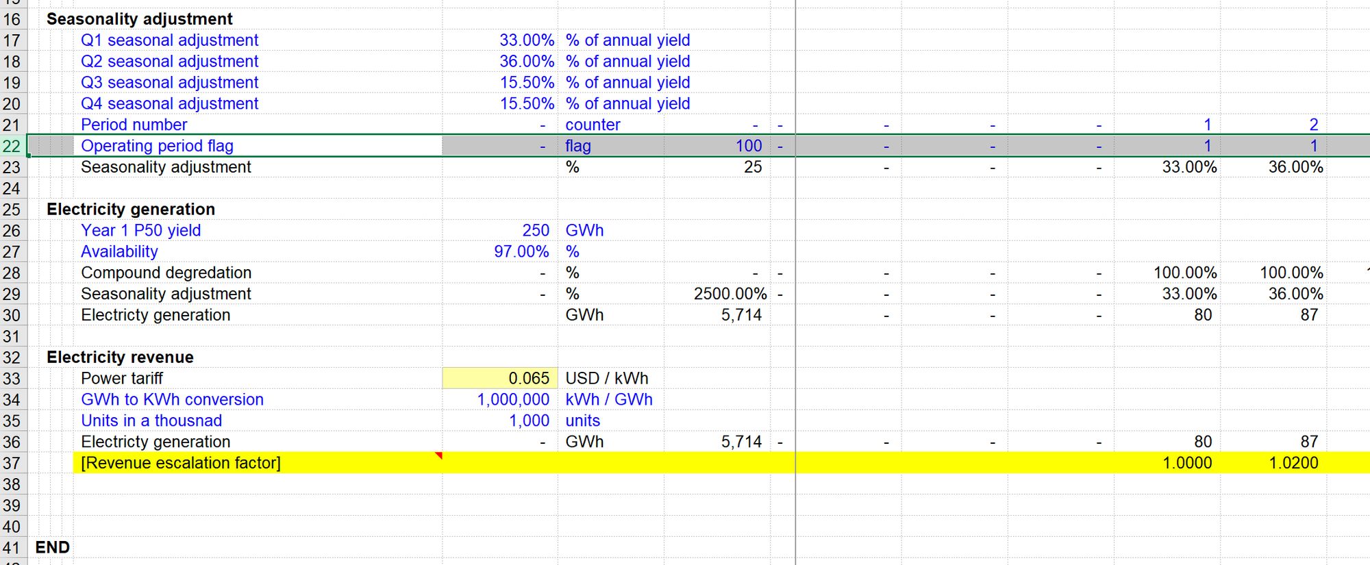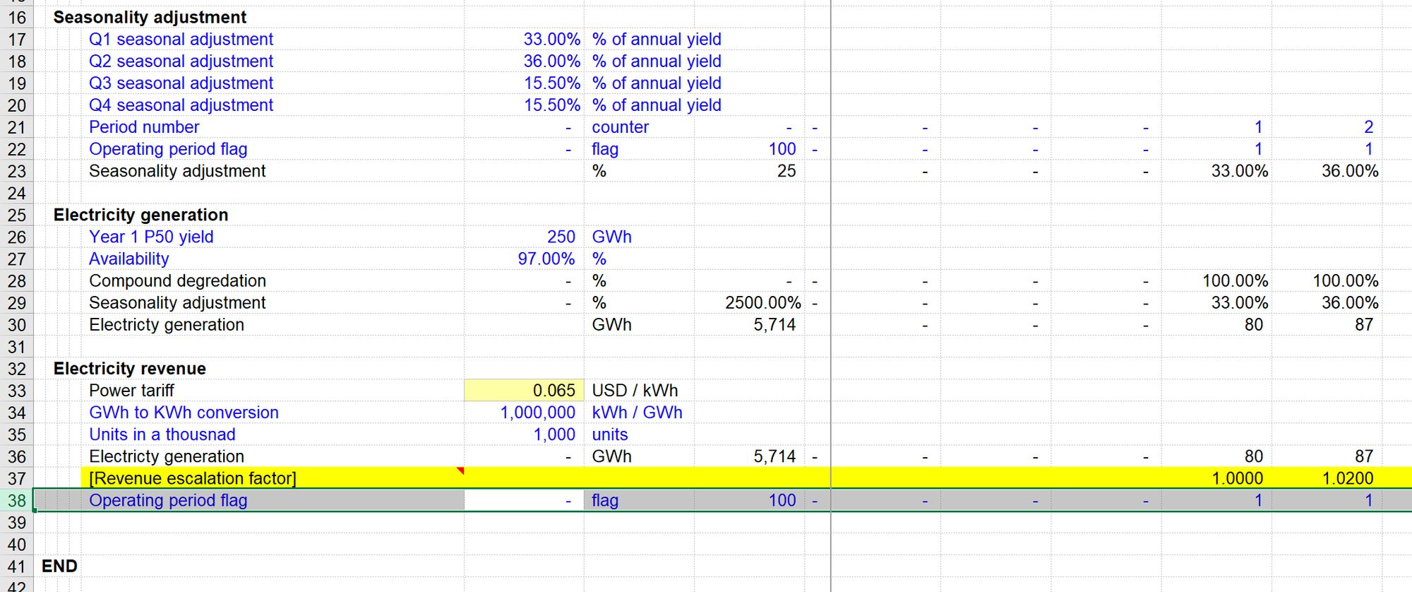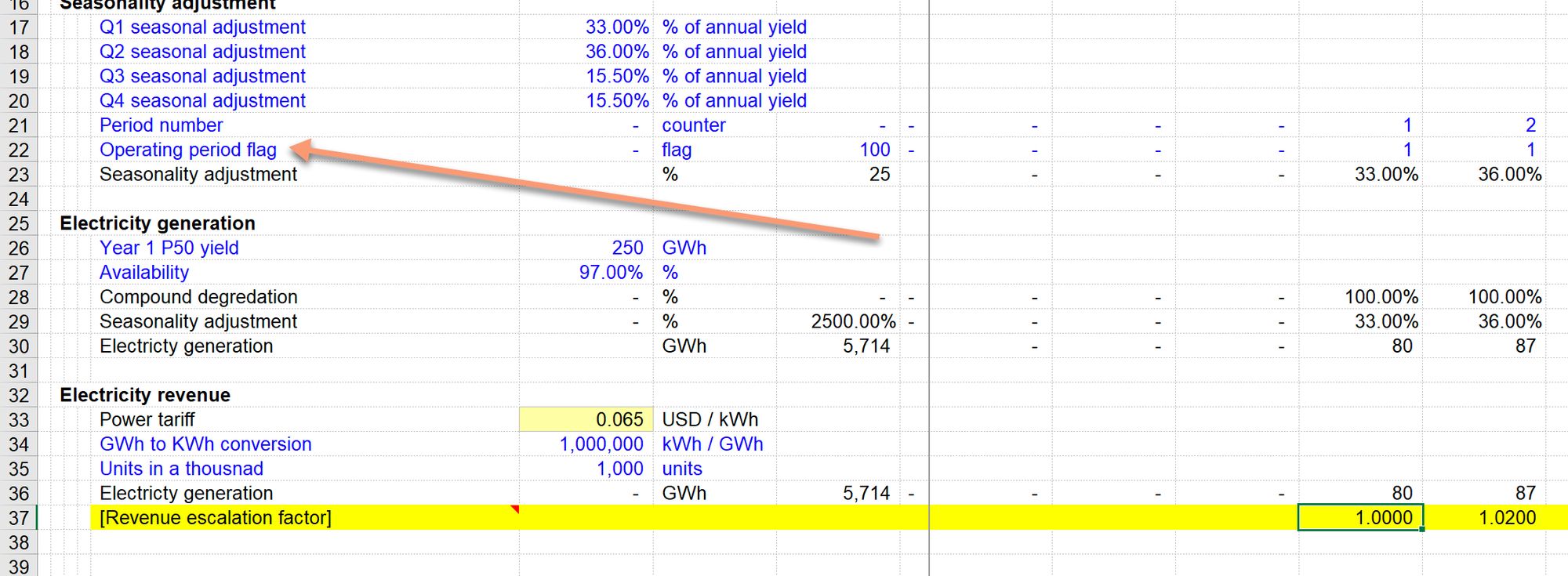 In our example calculation block for Electricity generation revenue, the last ingredient we need is the Operating Period flag.