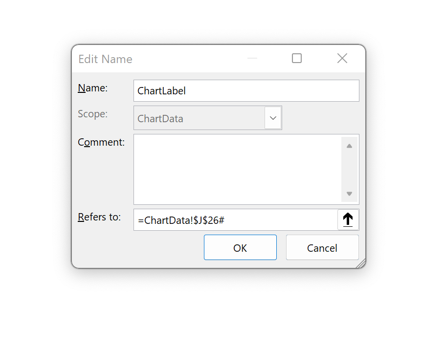 Using Excel's Name Manager (which we can open with Ctrl+F3), we set up two Range Names. I have called these ChartLabel and ChartValues)