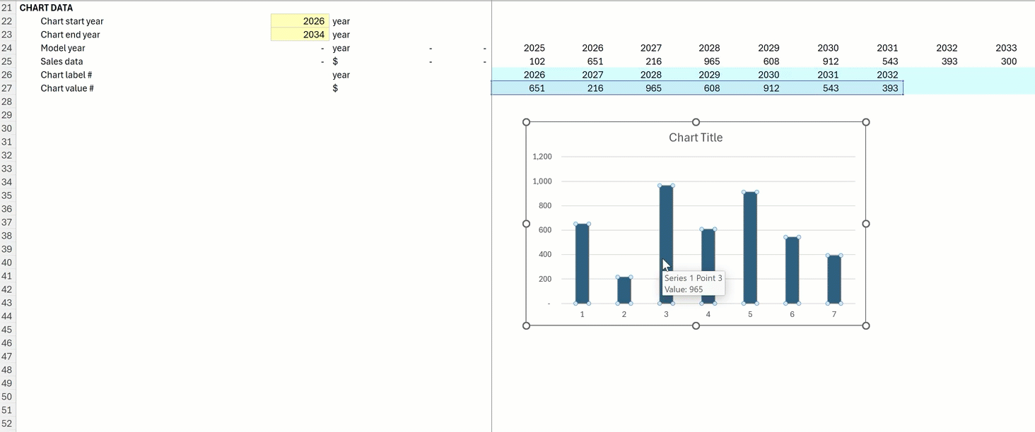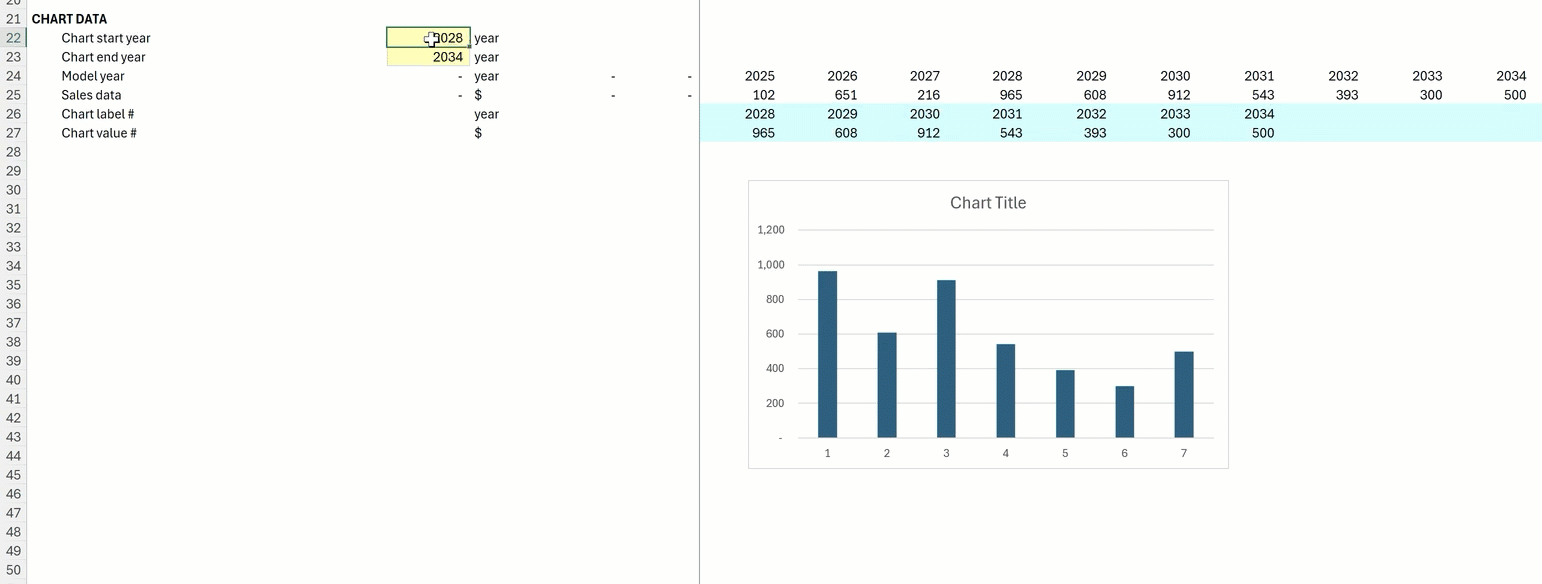 This chart will already work dynamically. As we change the inputs for start and end year, the chart will update automatically: