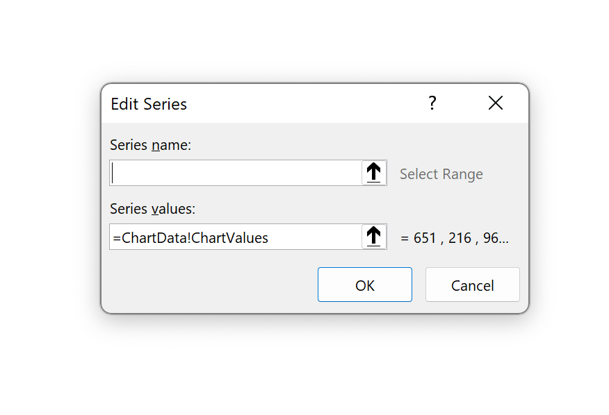 We'll do the same for both Range Names we need for the chart, one for Labels and one for Values. Of course, we would use more specific Range Names if we had multiple charts.