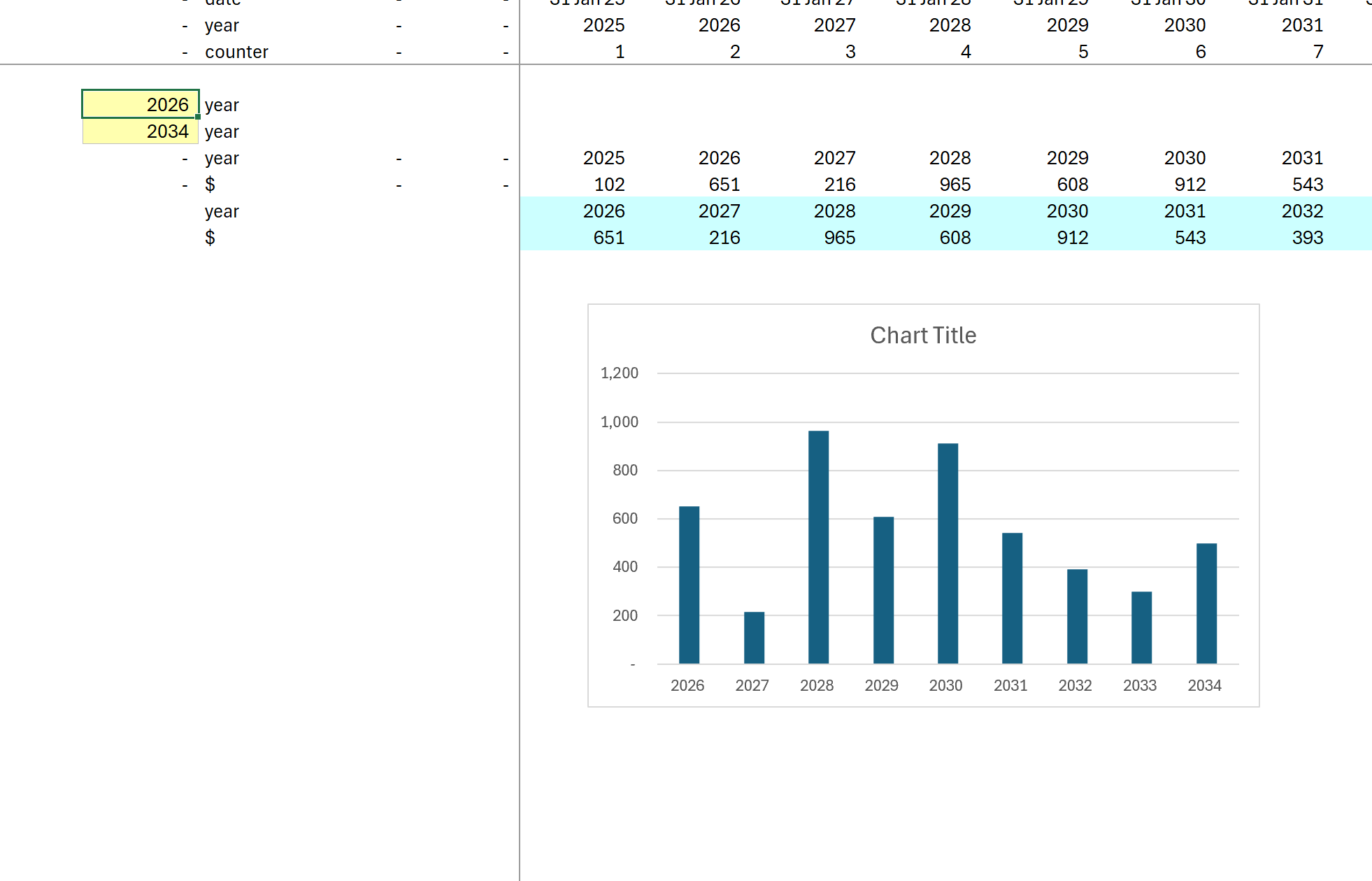 We now have the chart timeline and the chart data as Dynamic Arrays. If we change the chart end year to 2034, for example, both Arrays will change size: