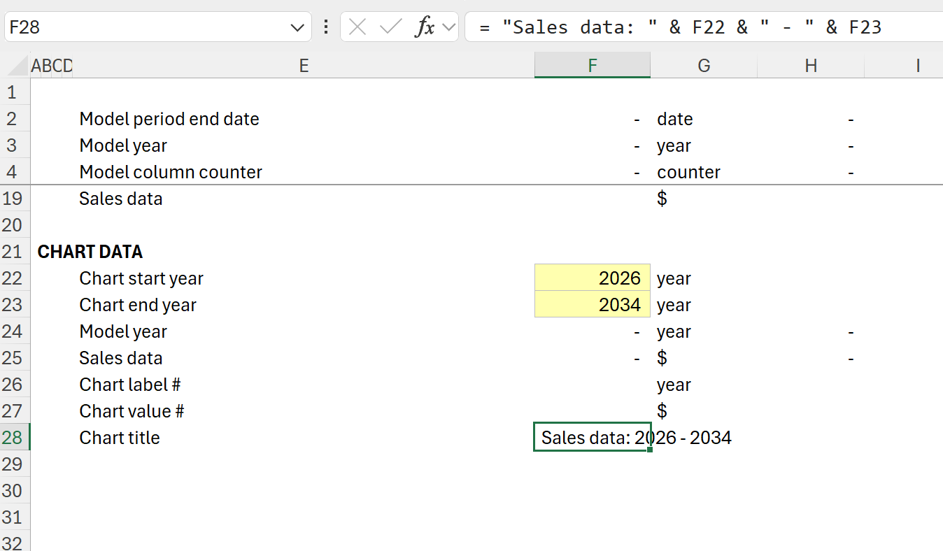 A final useful update we can make to the chart is to include a dynamic chart title that makes it clear what time range it is showing. To do this, I have created a concatenated text label that refers to the start year and end year: