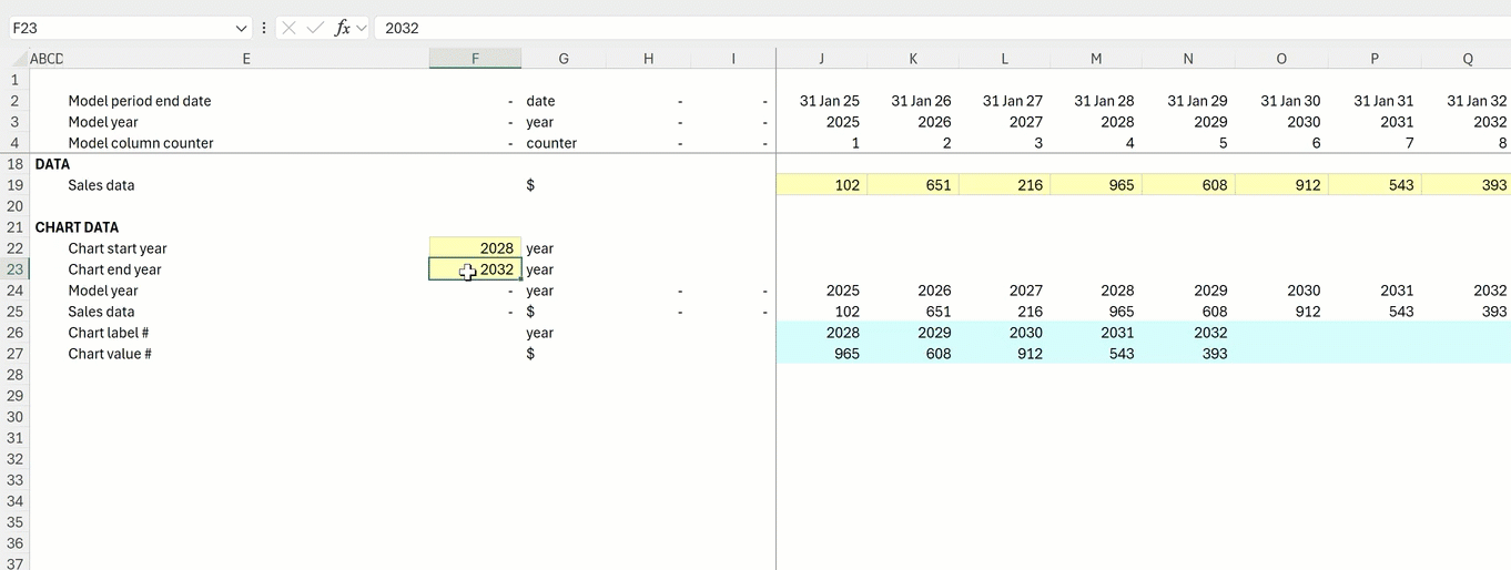 I've been increasingly interested in how we can use Dynamic Arrays in our models to achieve timeline flexibility. This is especially useful for charts.