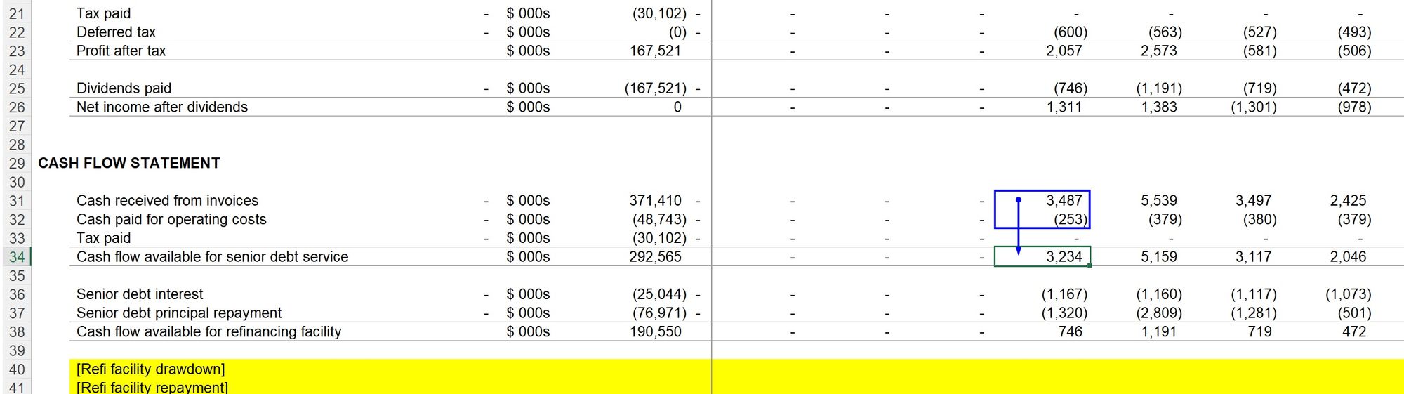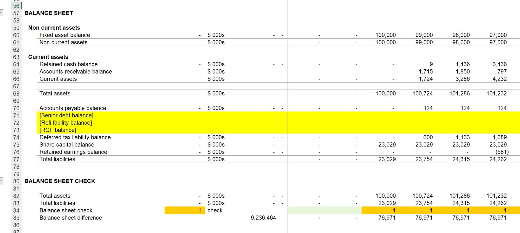 You can see from the balance sheet difference that the error starts at the transaction date, and the quantum of the error doesn't change. This indicates that the problem lies with the opening balance sheet. In this example, it's pretty easy to see the cause - there is $100m of asset on the opening balance sheet but only $23m of financing. The senior debt balance is missing entirely. Fixing this type of error requires you to look at the opening balance sheet and find the source of the problem there.