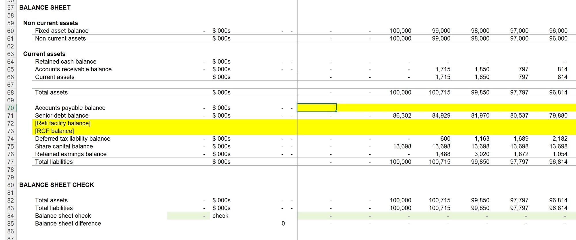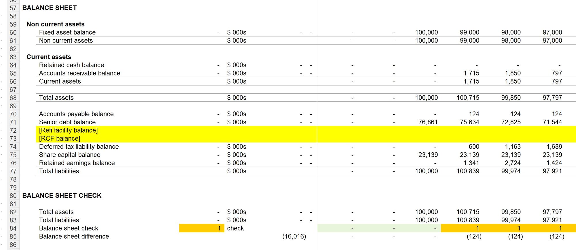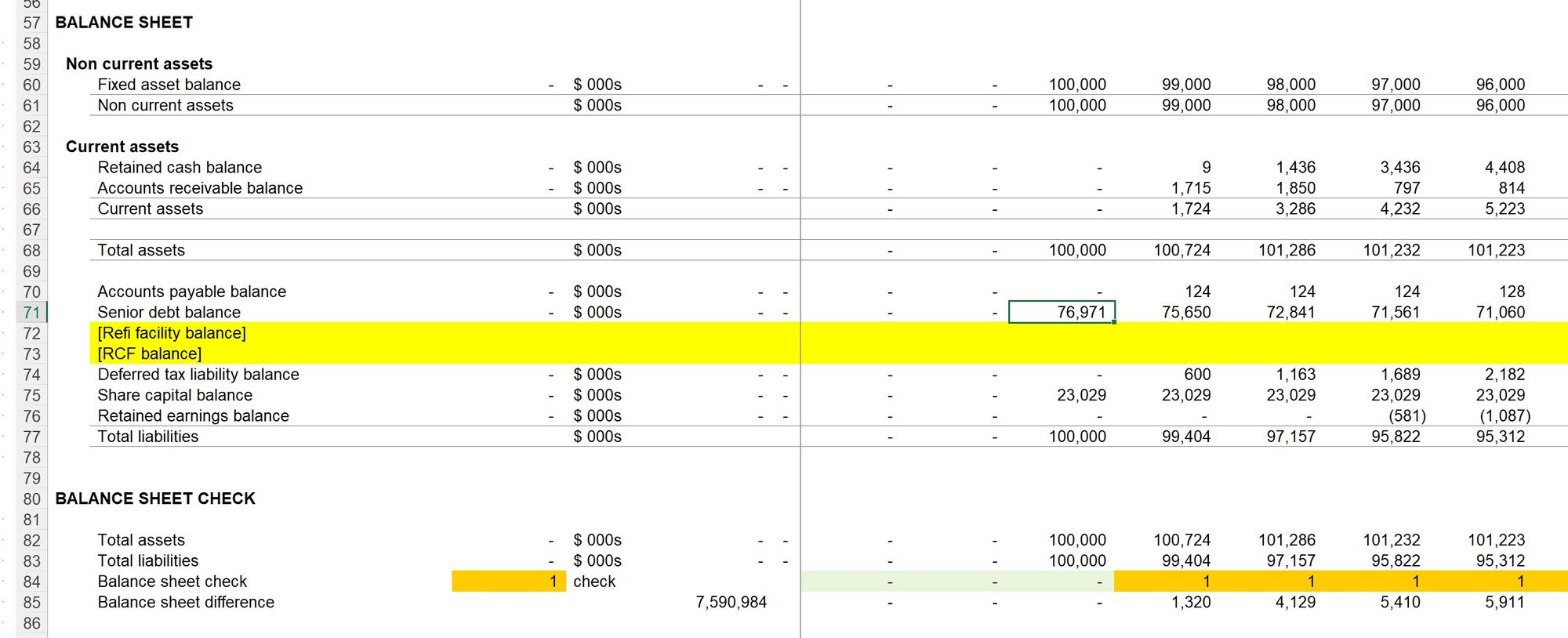 In the above example, we have added back the senior debt balance. The opening balance sheet now balances. Now there is a balance sheet difference that changes over time. This tells us that there is an issue with the line items going through the income statement or cash flow. In this case, the senior debt repayment is missing from the cash flow. And so the senior debt balance is reduced by the amount of the debt repayment, but the cash is not, causing our balance sheet problem.