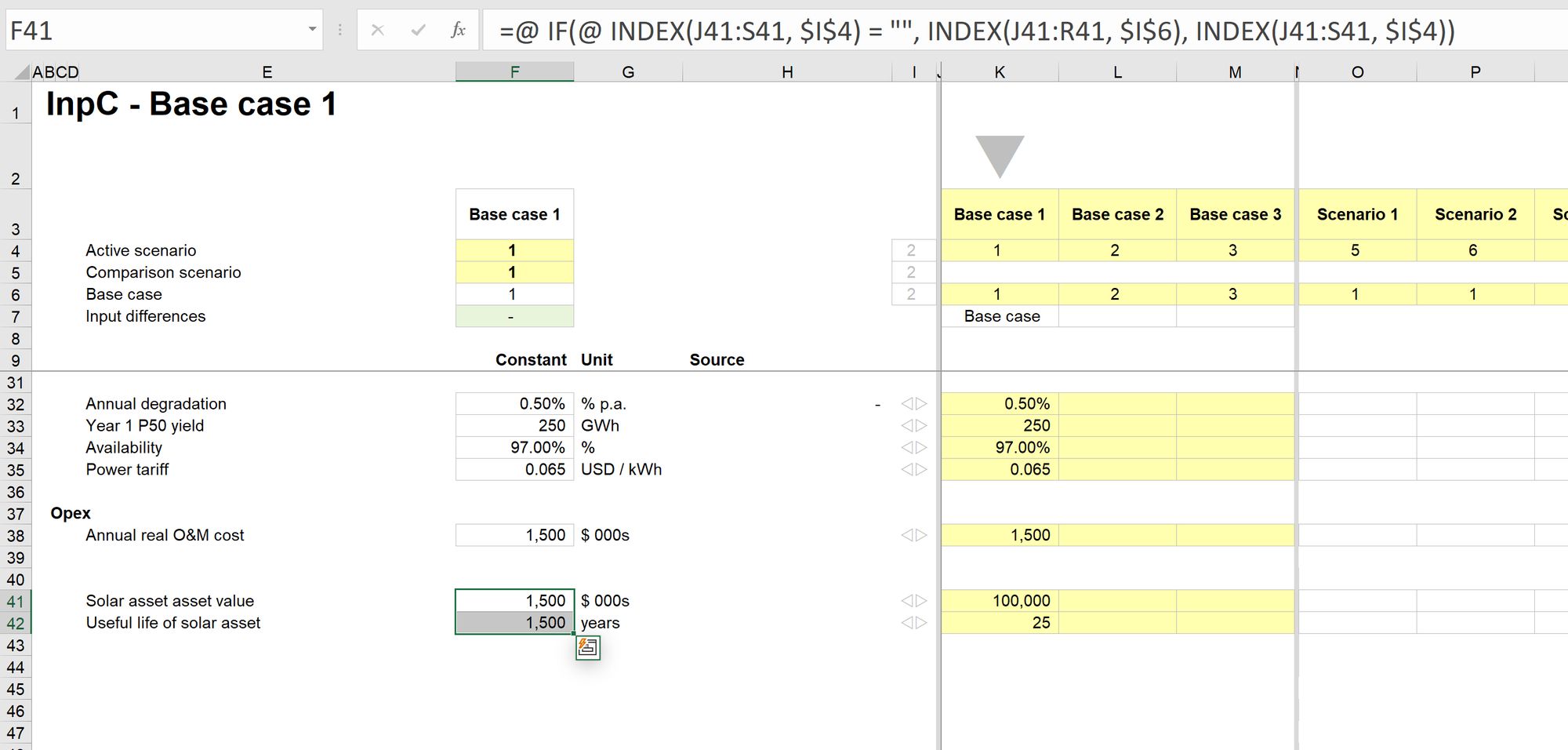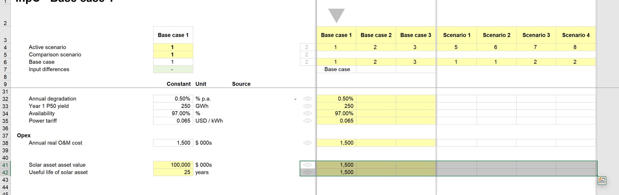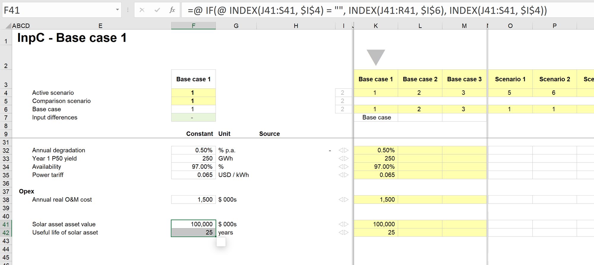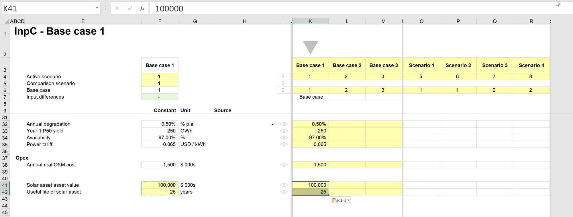 The inputs are now located at the bottom of the input sheet and set up with a complete "Input scenario" structure.