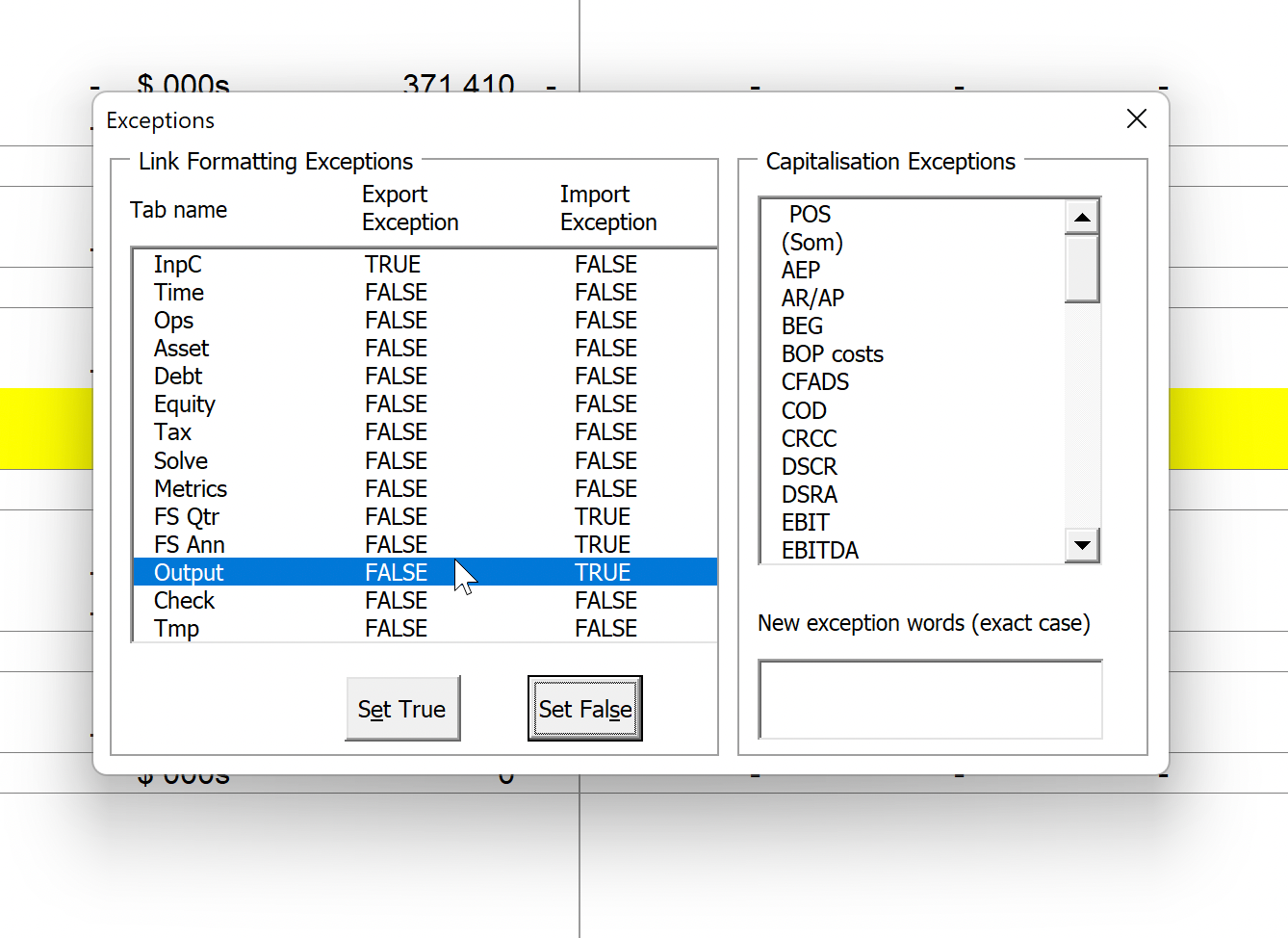 To change the setting for a sheet, select it in the list, then click set true for either export or import marking.