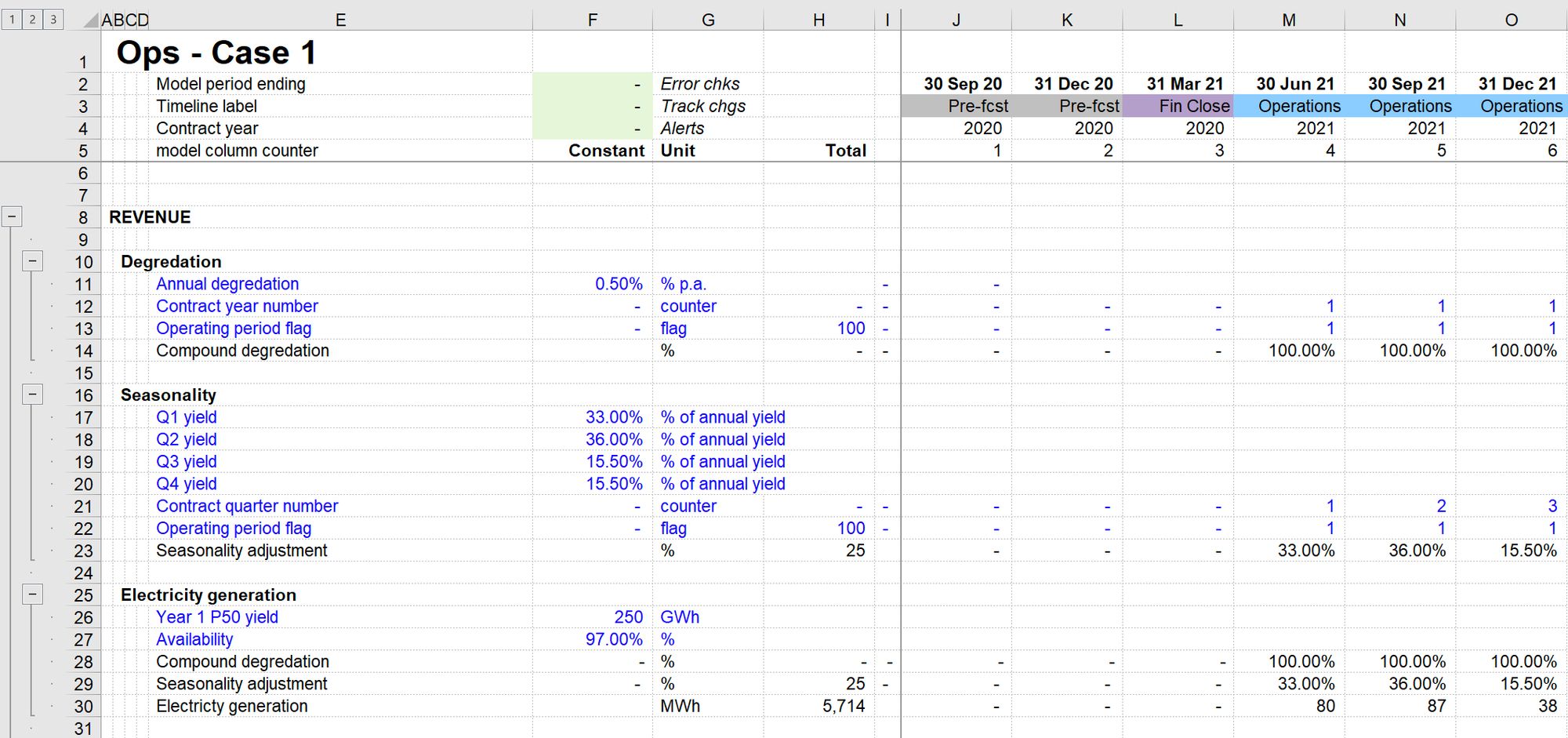 Column J is the first of our time-based columns. Each column from J onwards will represent the same amount of time. If our model is monthly, each column will represent one month. It's essential that this is common across all calculation sheets of your model, or else you will be in a world of pain and error. On occasion, particularly in Project Finance models, we will have two timelines. The principle still stands - all the monthly construction sheets have a standard timeline, and all the operational sheets, which may be quarterly or semi-annual, have a standard timeline.