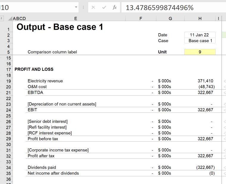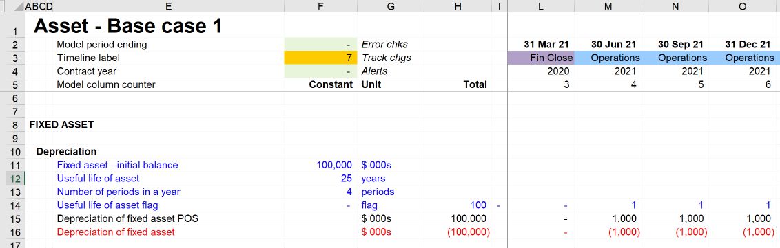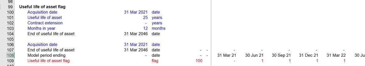 - Calculation of the End of useful life of asset date. For this, I'm copying the block from the Last operating period flag. I'm swapping out "Operating years remaining" and replacing it with "Useful life of asset" (a link to a new input on the input sheet). At present, these values are the same, but they might not always be.