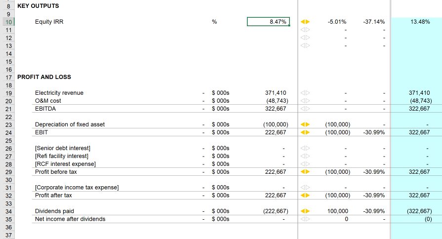 Looking at our output sheet, we can see that total Profit after tax has been reduced by $100m. And that dividends paid are now $222.7m.