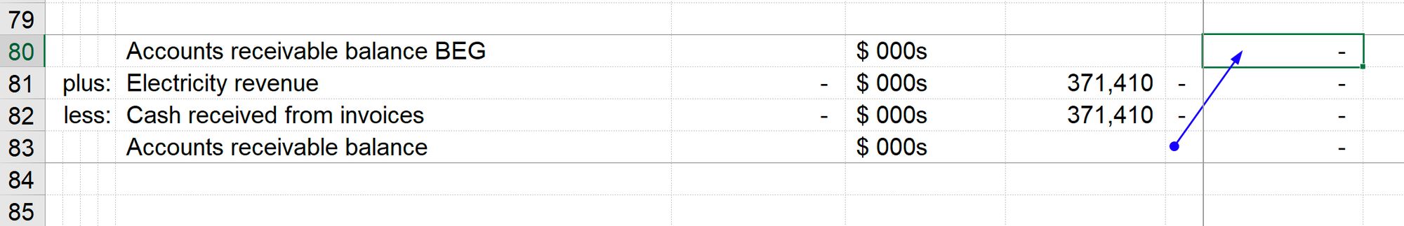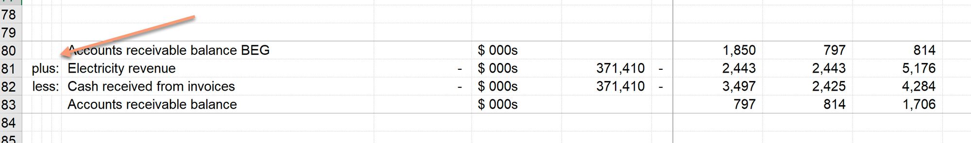 It does. And when this happens, the appropriate balance (often the opening balance) should be linked to the calculation block where we calculate the flow. See the example below. In working capital calculations, the flow is an ingredient in calculating the balance. (Don't worry about what's going on here - we'll get into working capital calculations in specific detail later in the book).