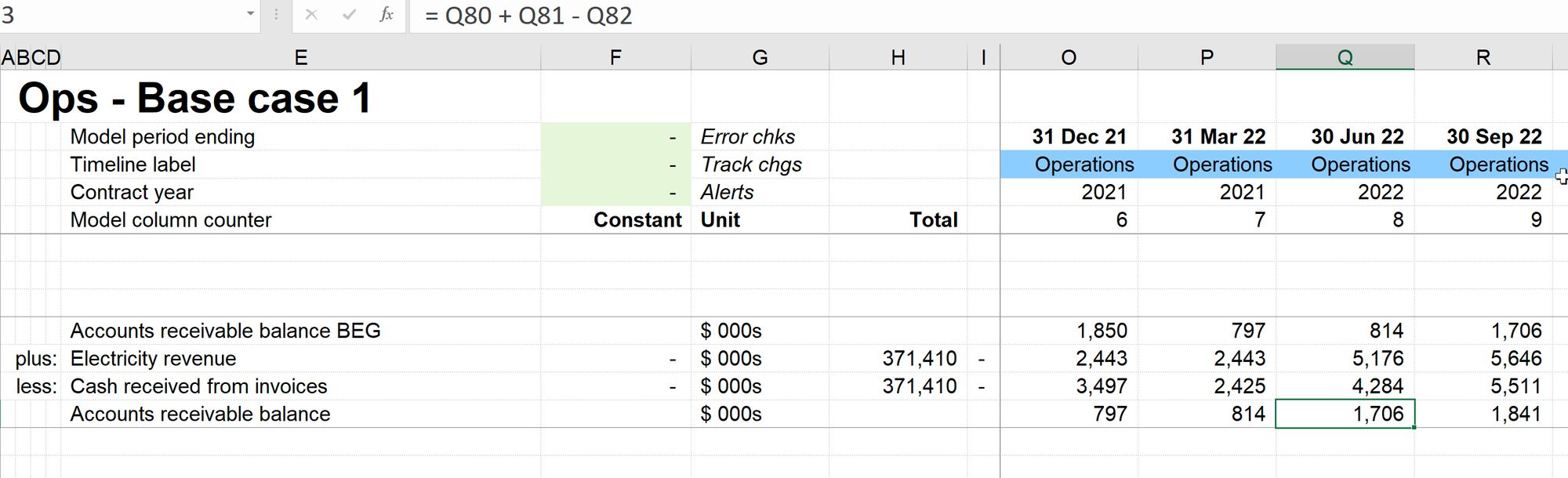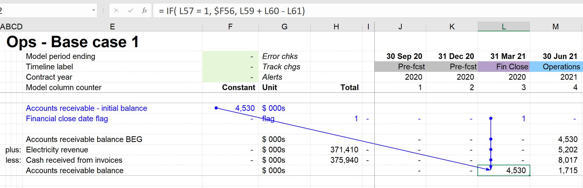 Our opening balance row is always looking back one period. Did I mention that the opening balance should always be the closing balance from the previous period? Column I exists in the model to allow this look back even in the first timing column. It's a small, narrow, empty column that just exists to enable the look to back in corkscrews to happen consistently across the timeline, without risk of pointing at a label or a row total or whatever junk you feel like putting on the left-hand side of your model.