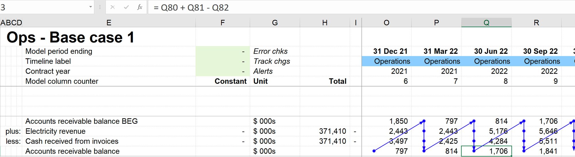 You may notice at this point that the downward flow is a positive number. As we'll discuss later, all of the numbers in the calculation area of our model are positive by default. We'll talk more about this in Chapter X and explain why we keep all numbers positive by default in the calculation sheets of the model.