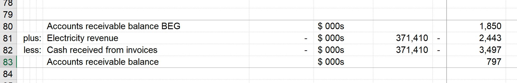 Since all numbers are positive, it’s not always clear when we are adding and subtracting rows in calculation blocks. Column D exists to allow helper labels, as you see below. This is not essential, and in all honesty, I often forget.