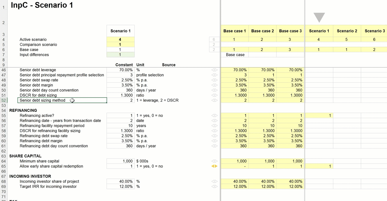 I can successfully create links for "Compound degradation" and "seasonality adjustment". However, in both cases, when I click Ctrl + Shift + a, the macro only copies across the next two columns (which are the constant and unit columns). When I enter the formula for electricity generation and use Ctrl + Shift +a, the macro has no problem copying the formula across the entire timeline. The problem only arises with the two inputs.