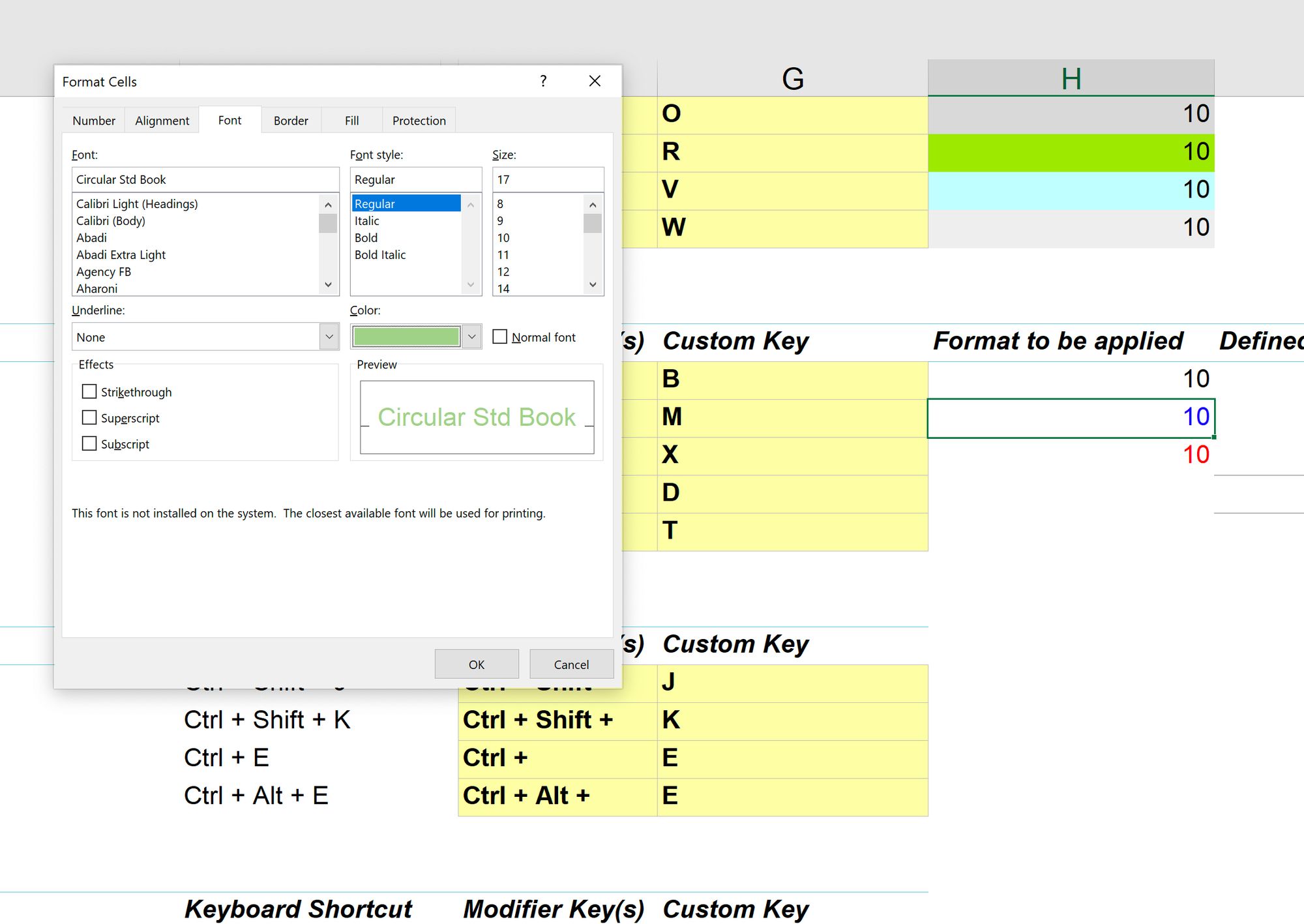 Hi there! Thank you for sharing this and giving us options to change keystrokes. However, I'm wondering if it's possible to change color code? For example, I would like my numbers imported from other worksheet to be green. I guess I only need to change color code in the Macro codes? Would you mind direct me to the right session to change that in the code?