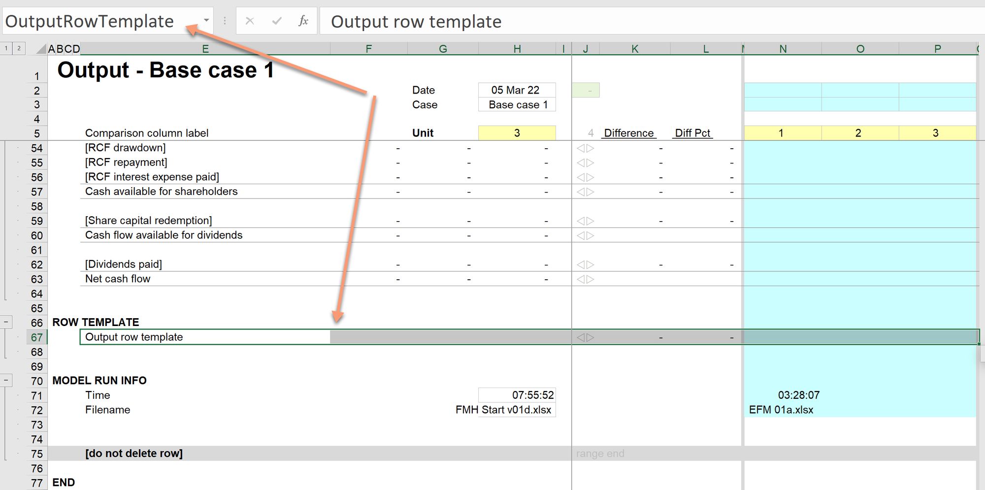 This is similar to the Input row template. The macro to add a new constant or row total to the output sheet needs the structure of a standard output track sheet row. See the reference start model for an example of how this is set up.