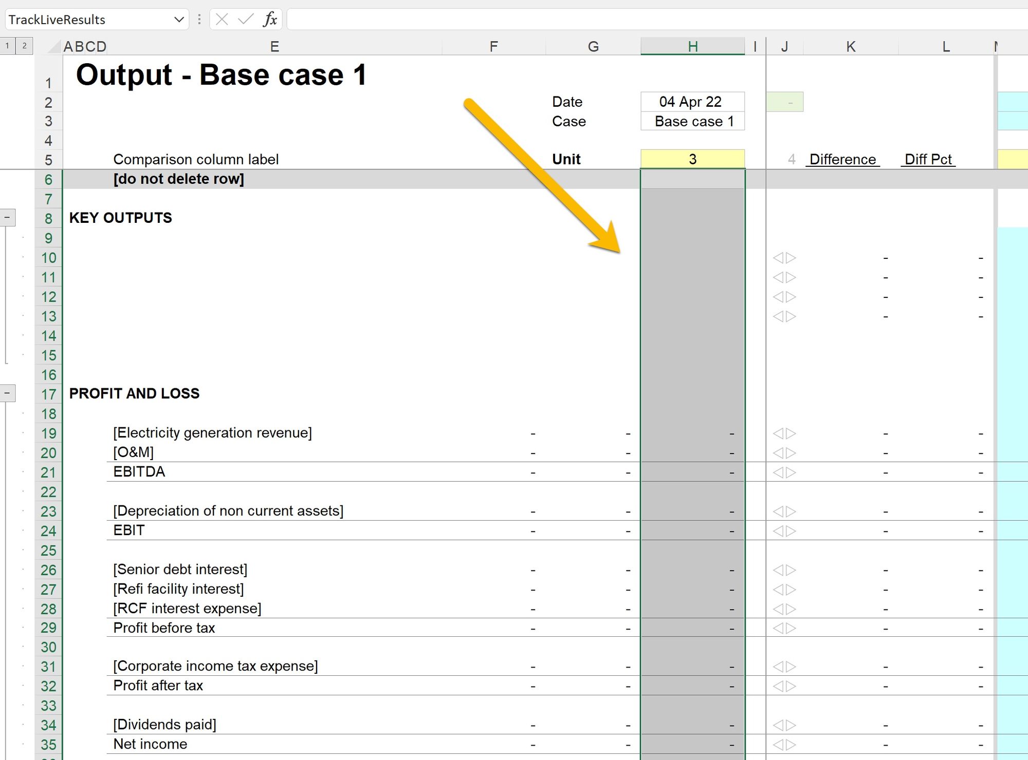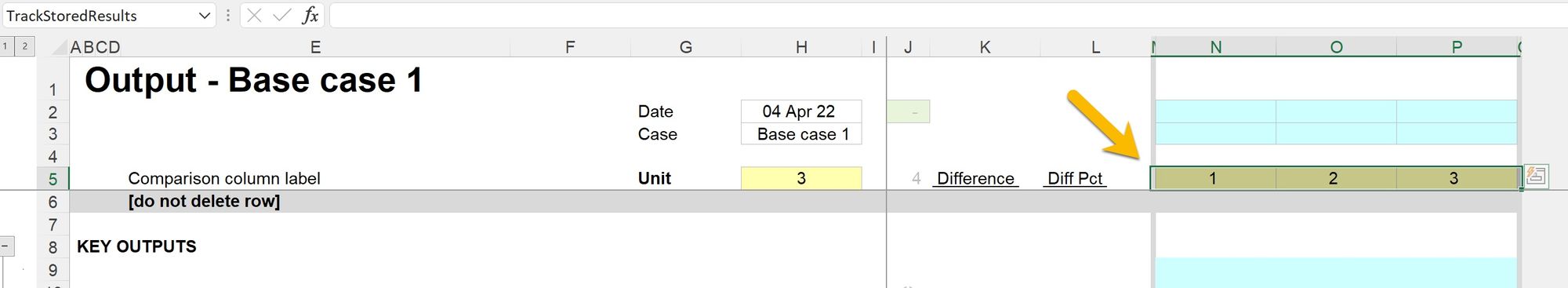 This should cover the entire range of the live outputs from the model, and should include the space rows at the top and bottom of the range. This tells the macro which results should be copied into the new stored output track.