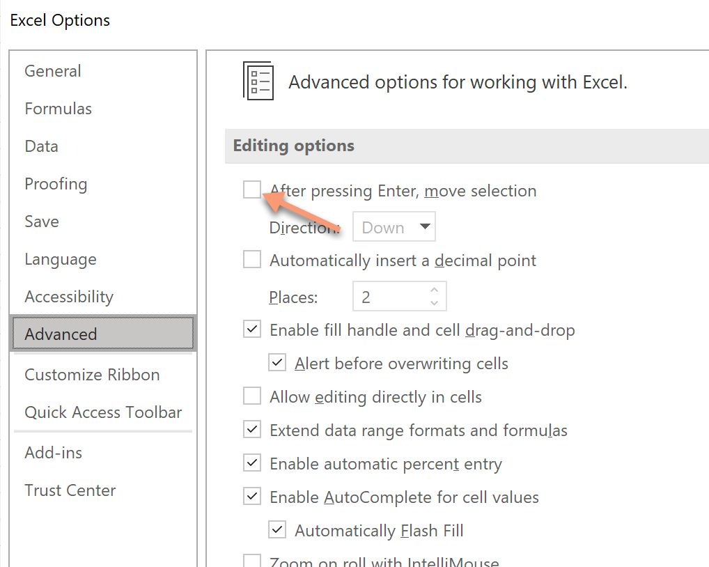 Go to File / Option / Advanced and untick "After pressing enter move down". This change may irritate you at first, only because it's what you're used to, and change is hard. Stick with it. You'll quickly realise that this is a crazy default, only useful if you're doing data entry in a vertical list. Usually, when you press enter in a cell, you've just written a formula. At this point, you want to do one of two things. Thing one. Examine the formula to check if it makes sense. Thing two. Copy the formula across a timeline. Neither of these things involved you being in the row below the formula.