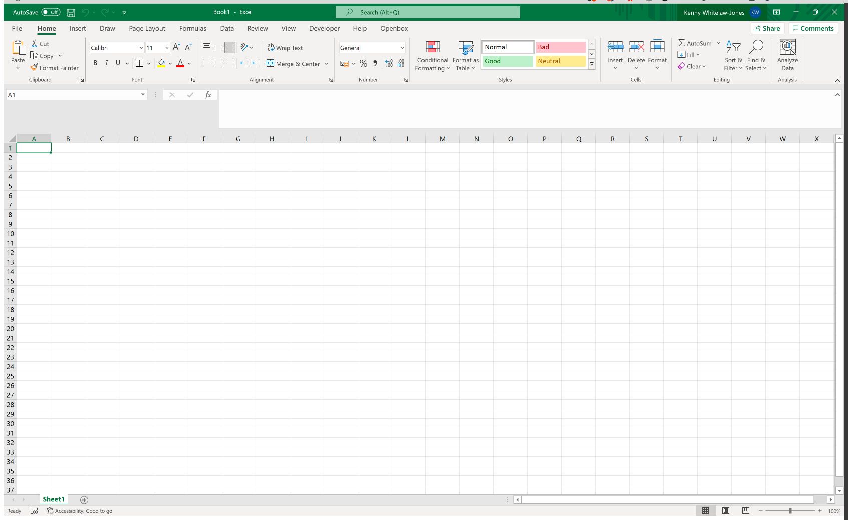Control+F1 will hide the ribbon. You can get it back when you need it by hitting the Alt key then choosing the keystroke for the menu you want. Also, minimise the formula bar with Ctrl+Shift+u. We're going to keep our formulas short, and they should always fit into the smaller bar.