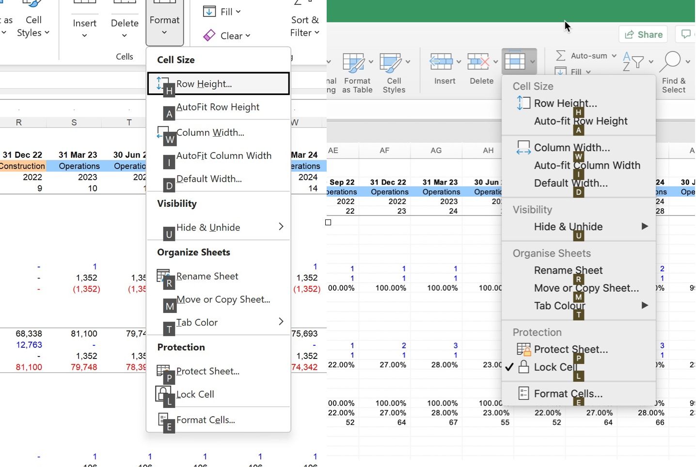Here is a side-by-side comparison of the Format Menu from the Home ribbon; Windows on the left, Mac on the right. Accelerator Keys has all the same shortcuts.