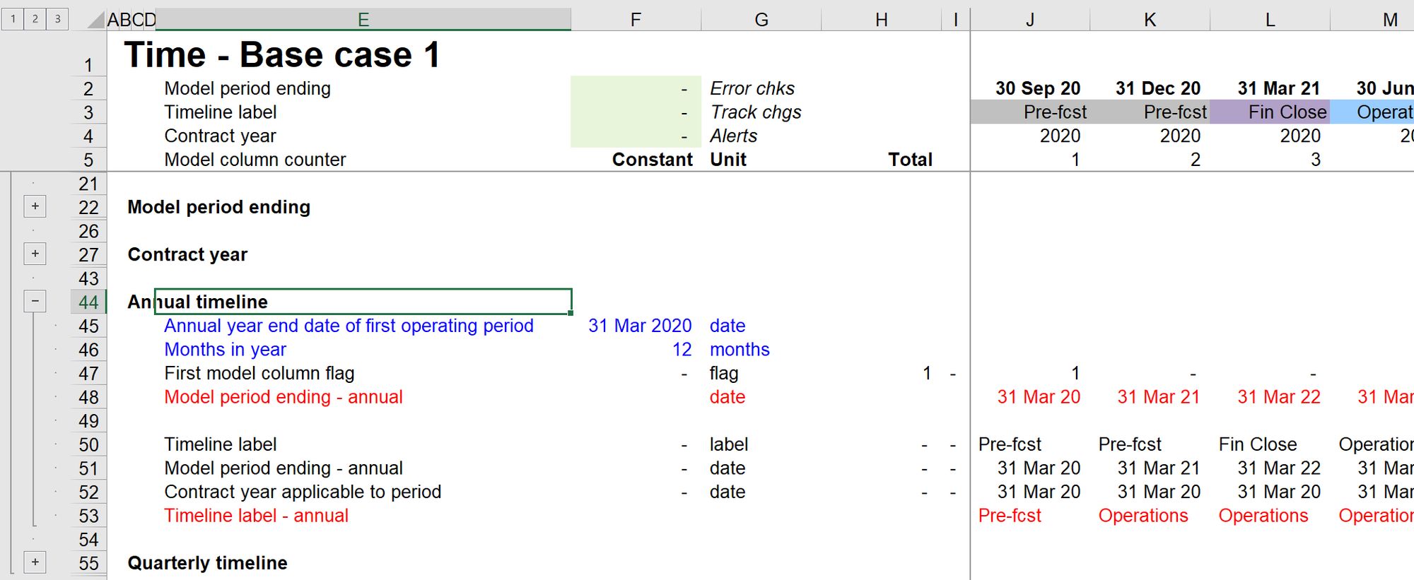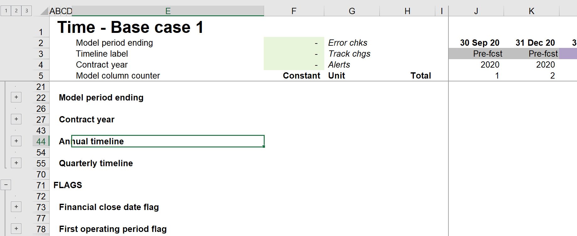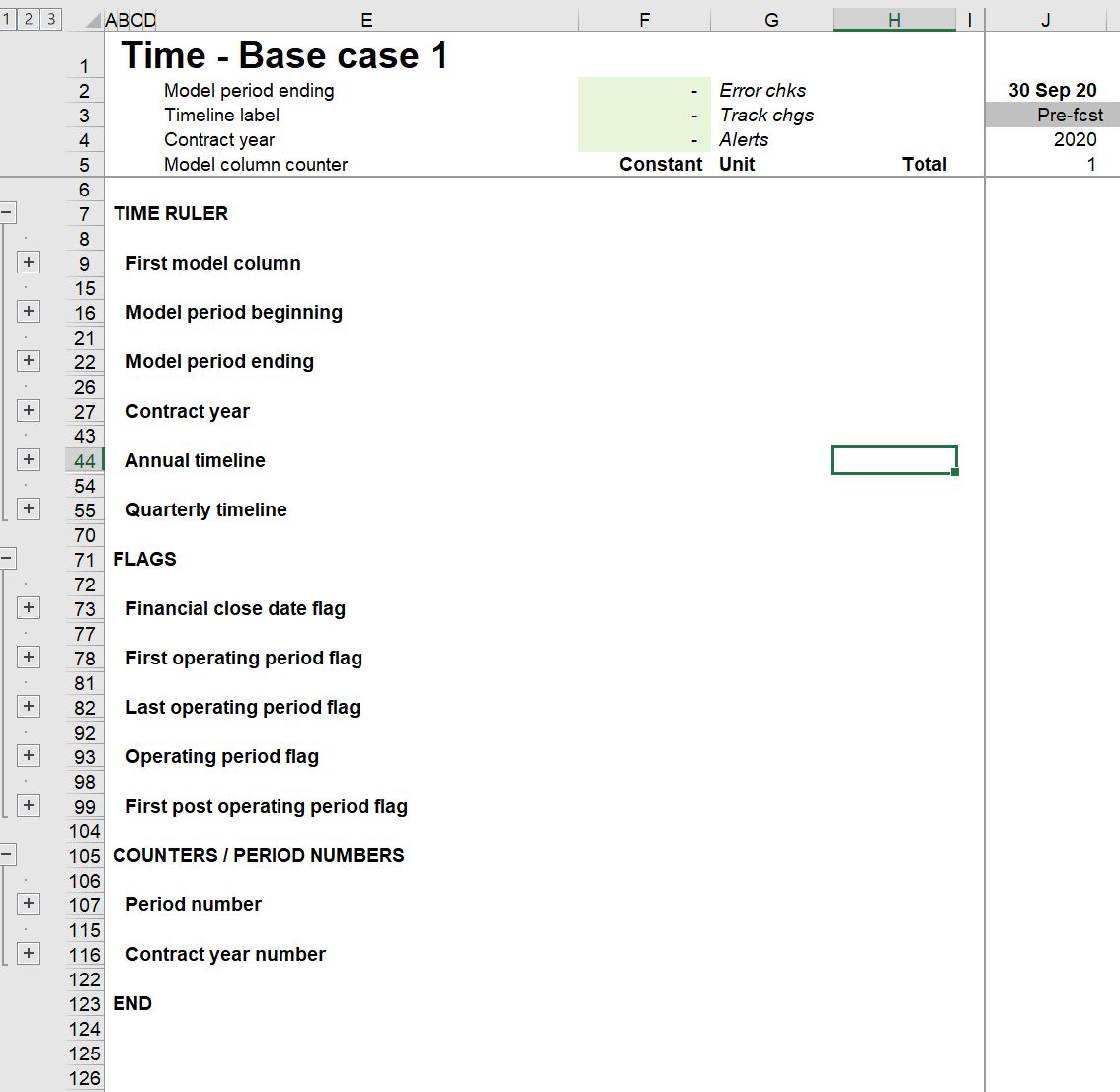 While working in the model, you may want to expand or collapse a single group. The native Excel shortcuts for this are cumbersome. There are two Productivity pack macros to help you. The keystrokes work according to where you are in a worksheet.