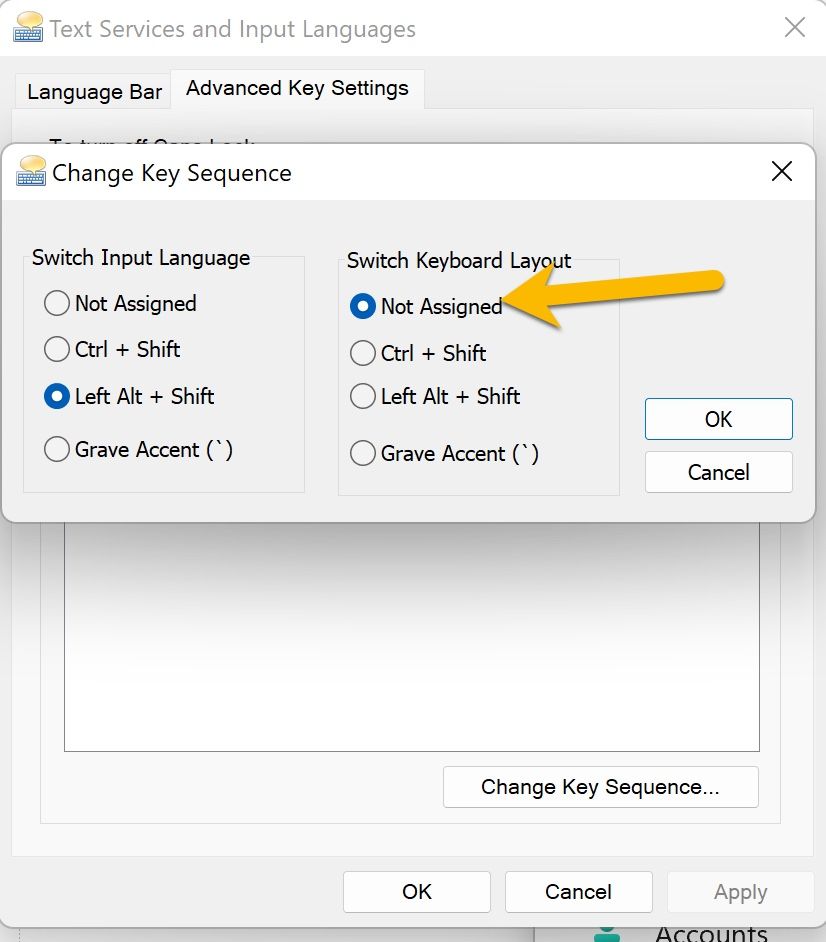 7 Select “Not assigned” under “Switch Keyboard Layout”