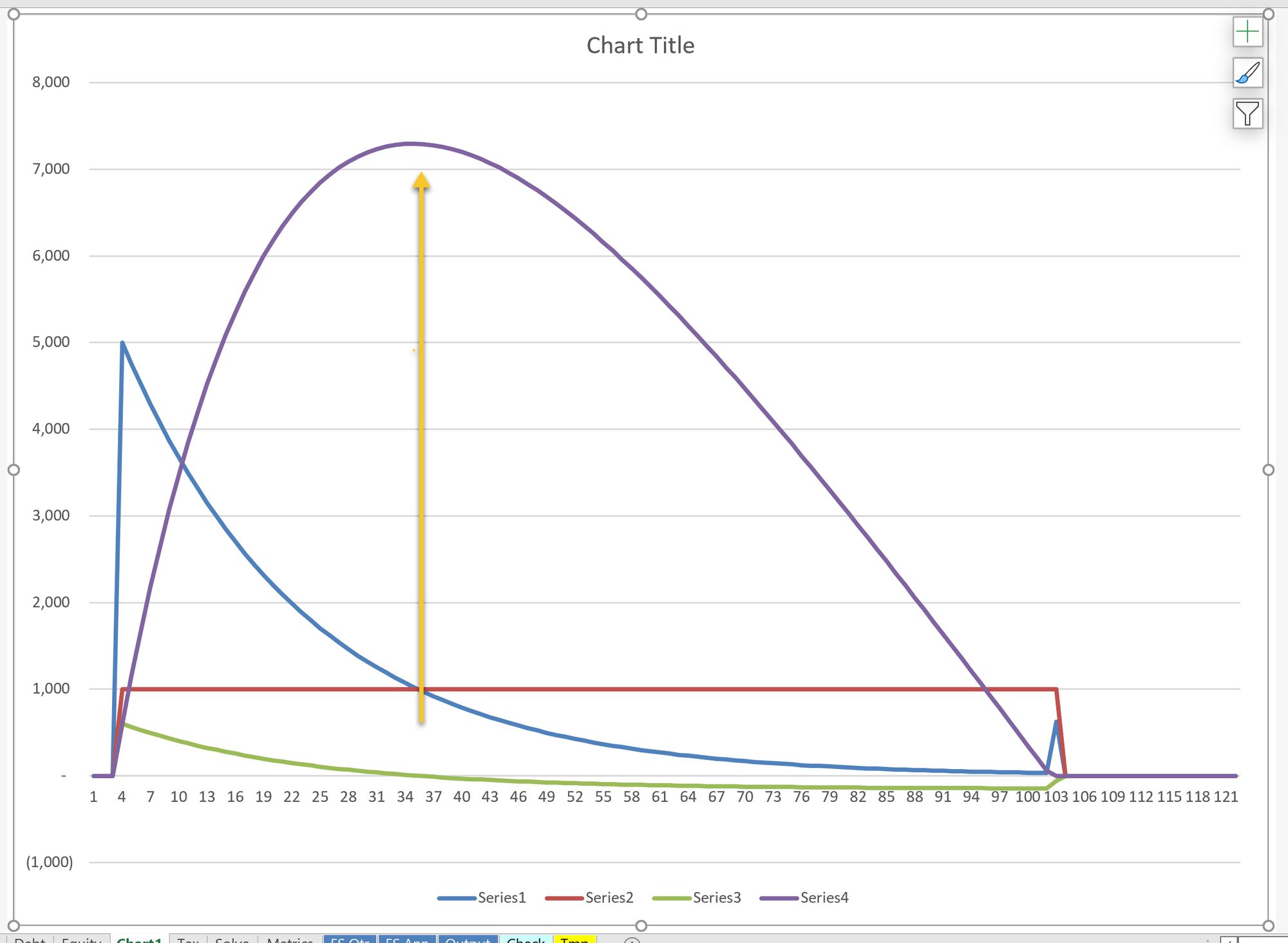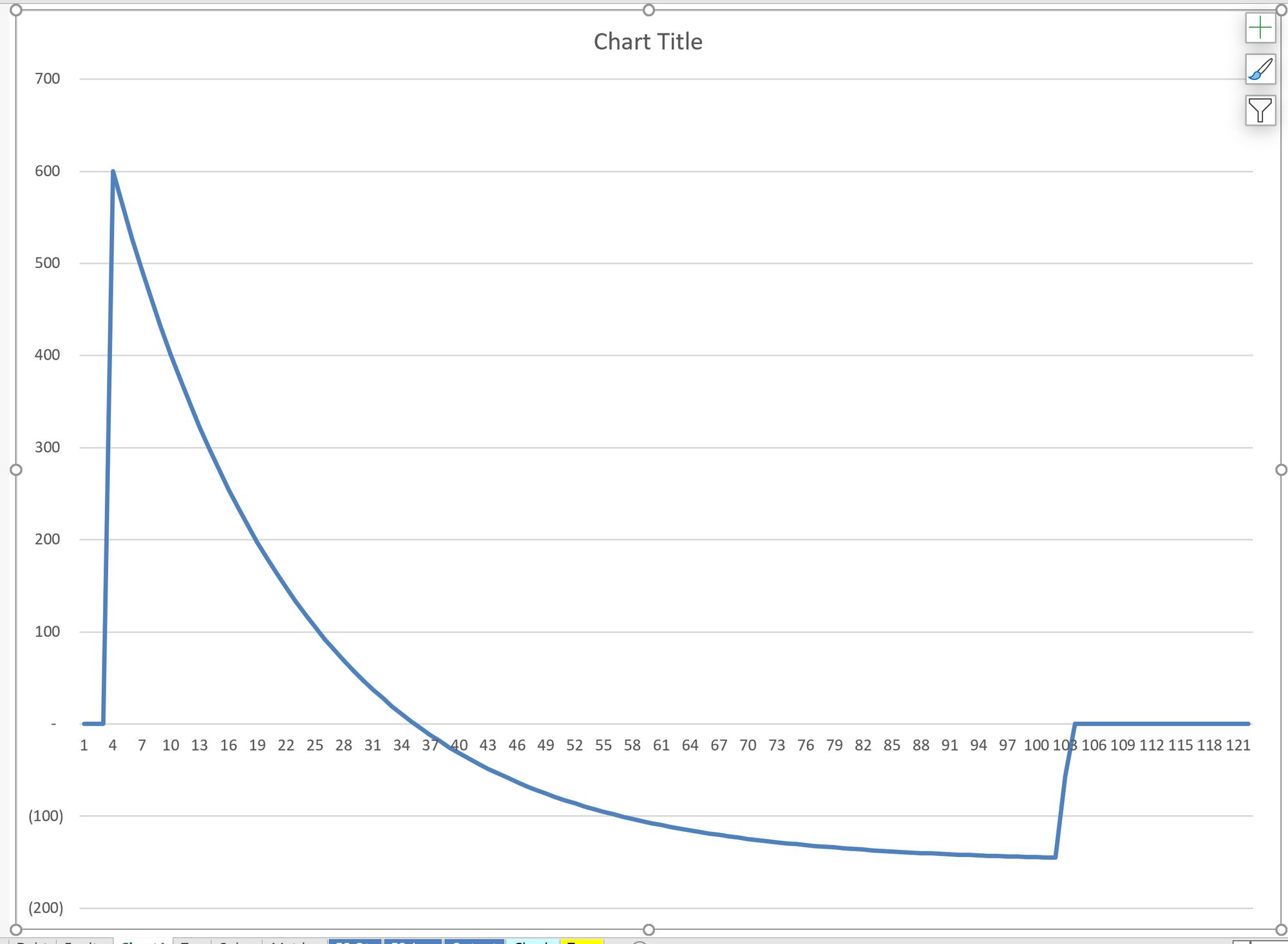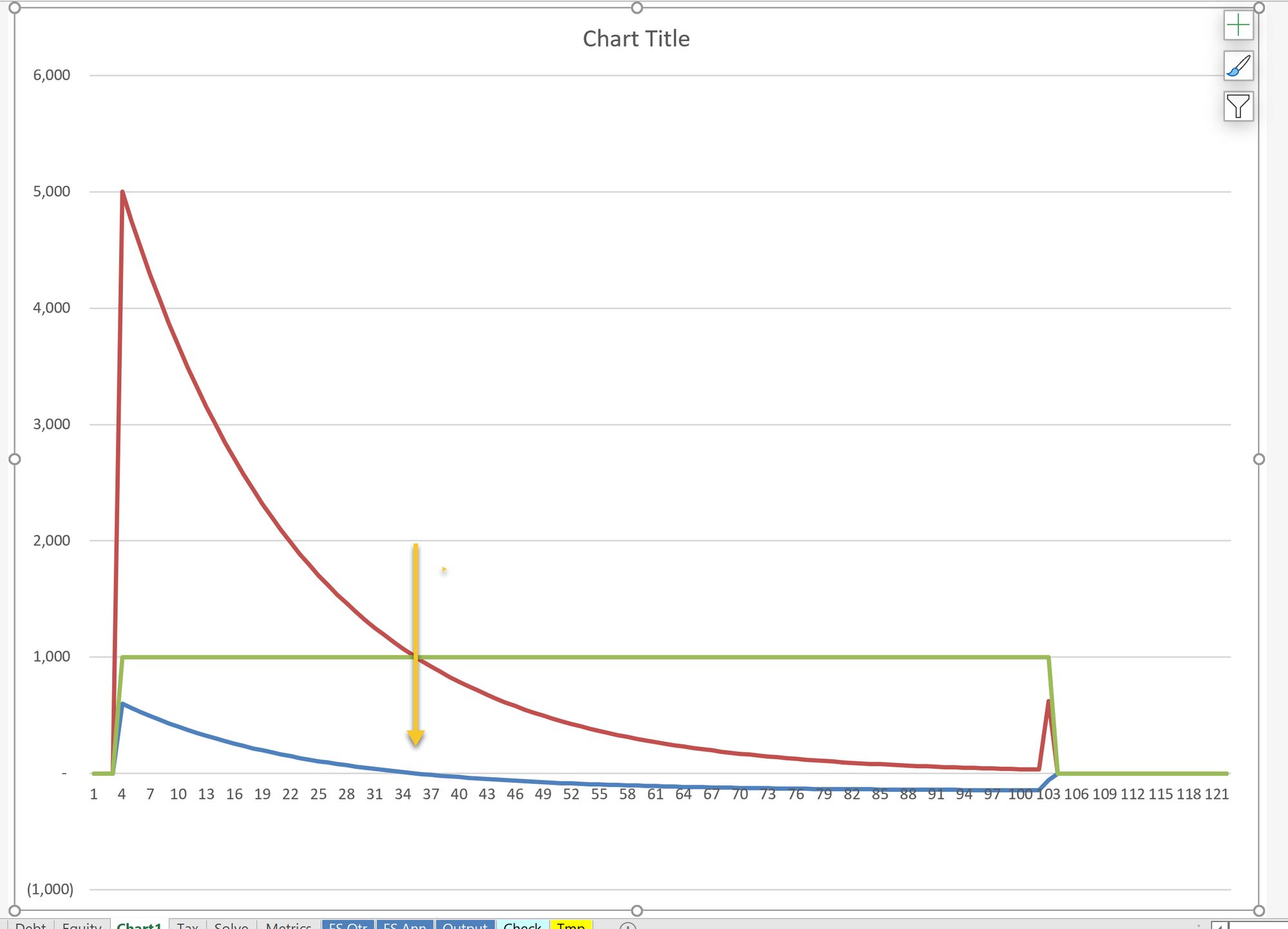 If we overlay the Tax and Accounting depreciation lines, we can see that the Deferred tax change becomes negative when Tax Depreciation becomes smaller than Accounting Depreciation. We should, at this point, see the Deferred tax balance start to reduce. We'll check this shortly.