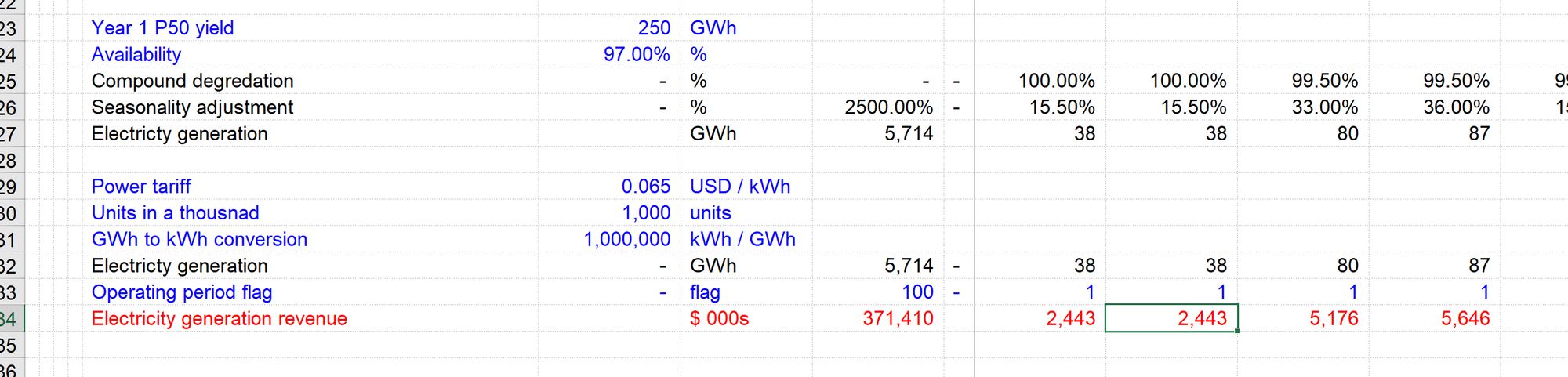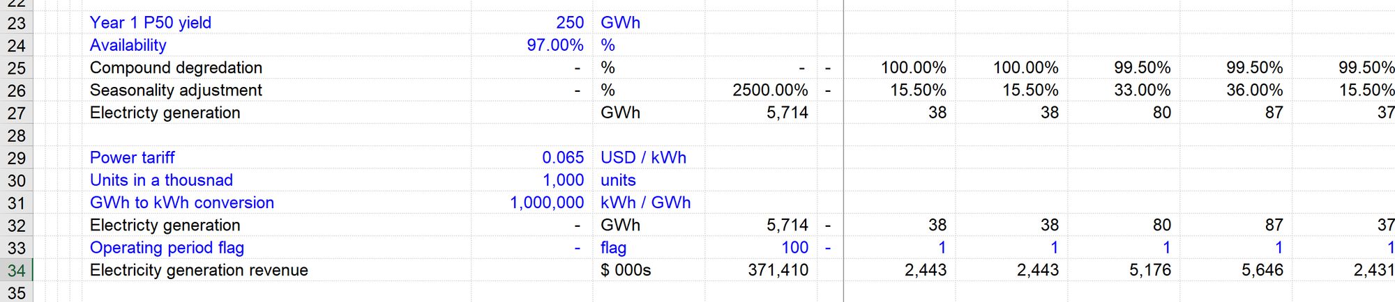 - Power tariff, GWh to kWh conversion, Units in a thousand and the Operating Period Flag are all coming from another sheet,