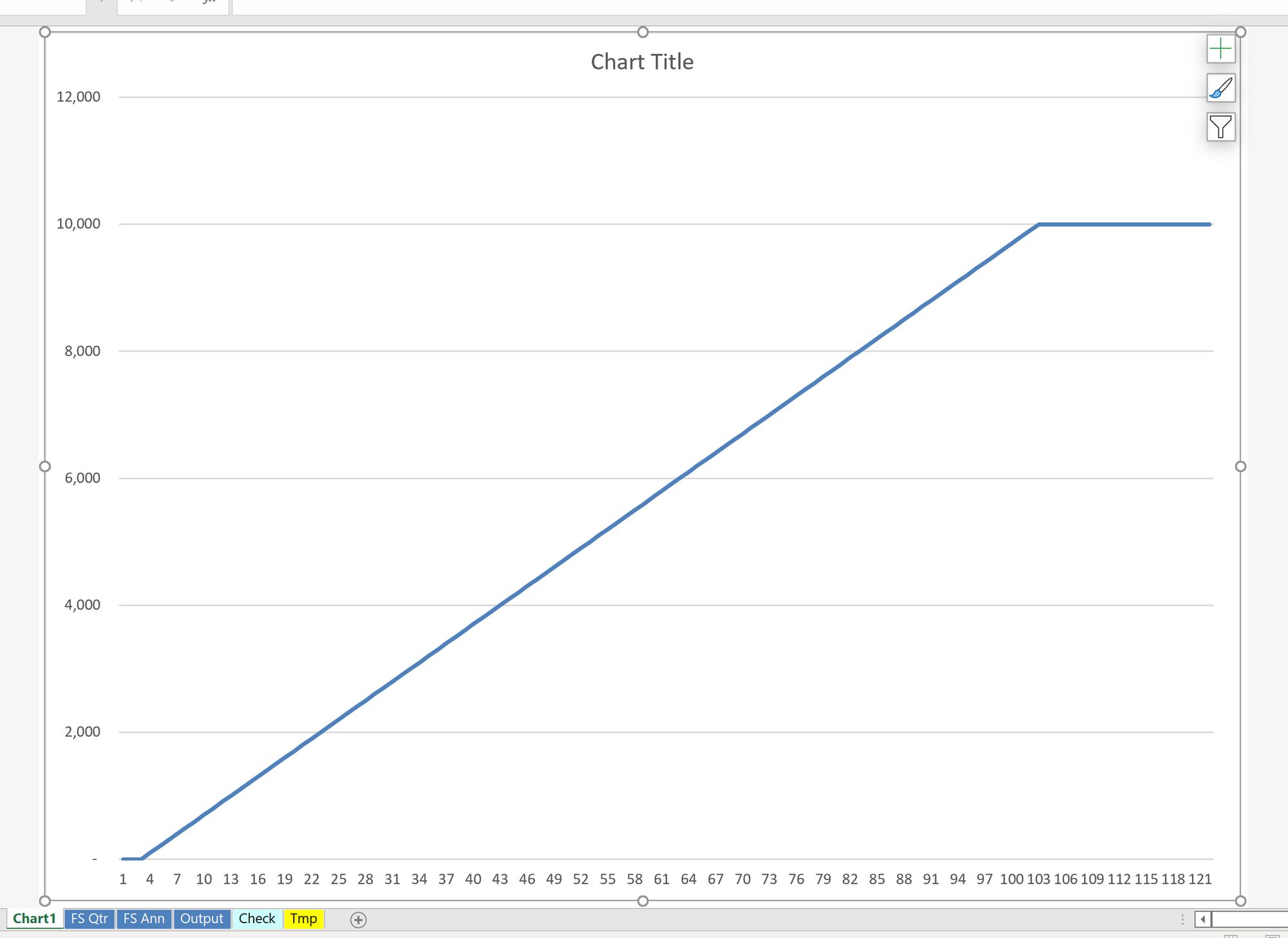 I have added $100,000 in each period. We have a quarterly model running for 25 years. Therefore the total revenue we have added is $10,000,000. Remember that the Standard Monetary Unit in our model is USD 000s.