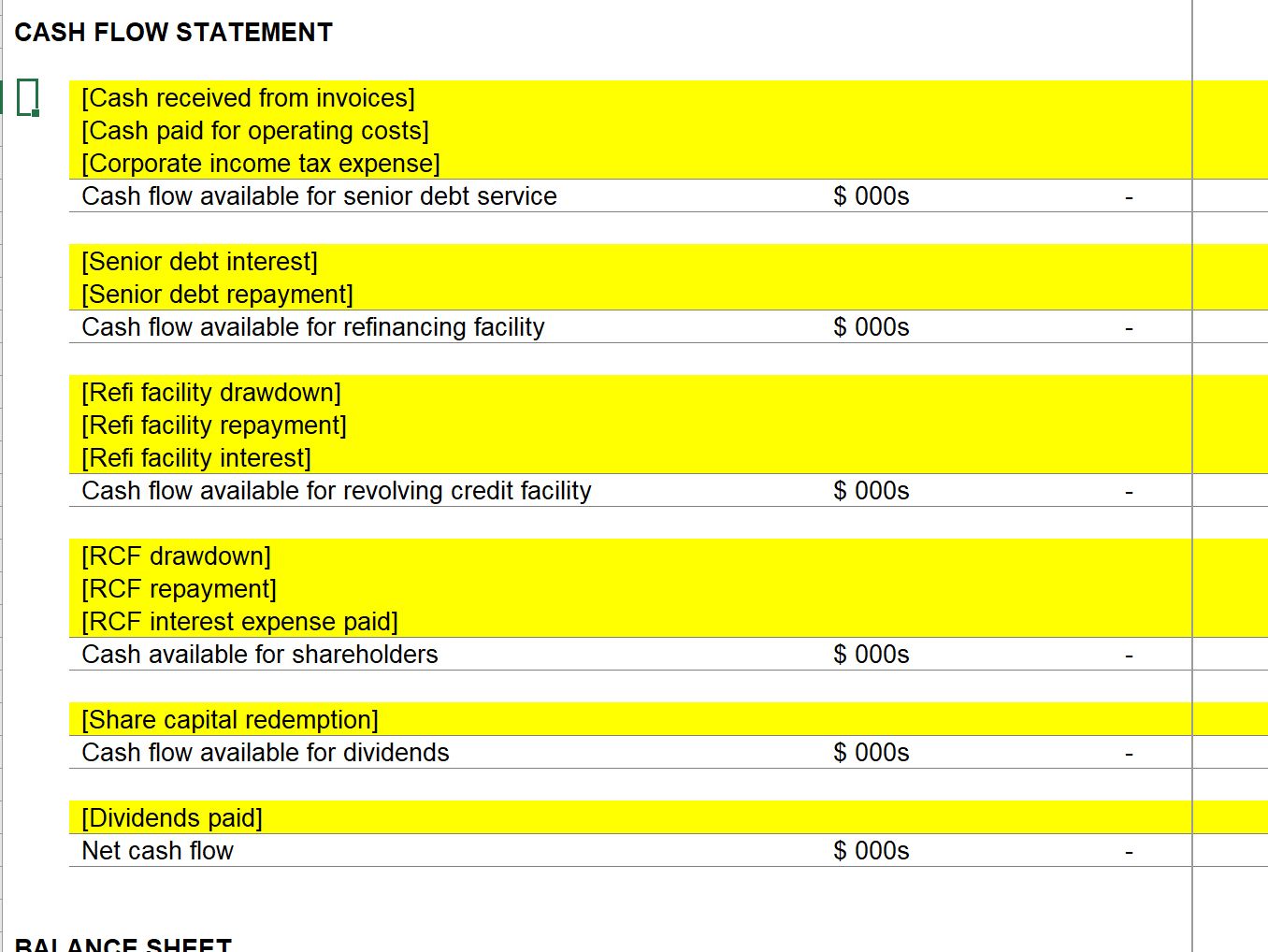 This is a "Financing cashflow" layout, also known as a Cashflow Waterfall. It's helpful for modelling as it shows the hierarchy of payments. We'll see more of this cash flow statement layout in later volumes of the Handbook when we look at Project Finance and Corporate Finance modelling.