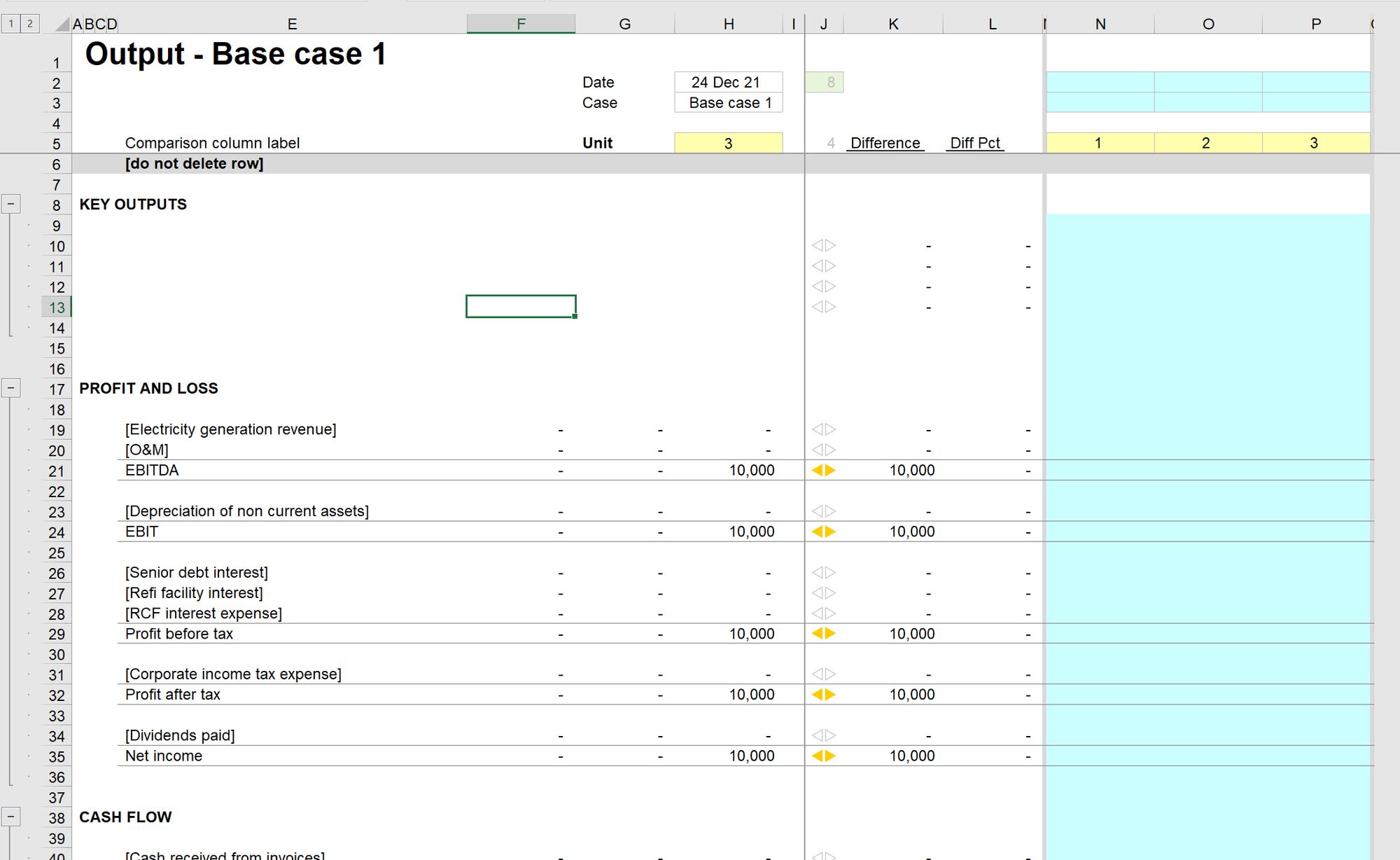 We can also see several change alerts on our output sheet. Now that we have added some values, our live values are different from our stored values. We'll leave this for now until we have some line items modelled then we will start to track our changes.