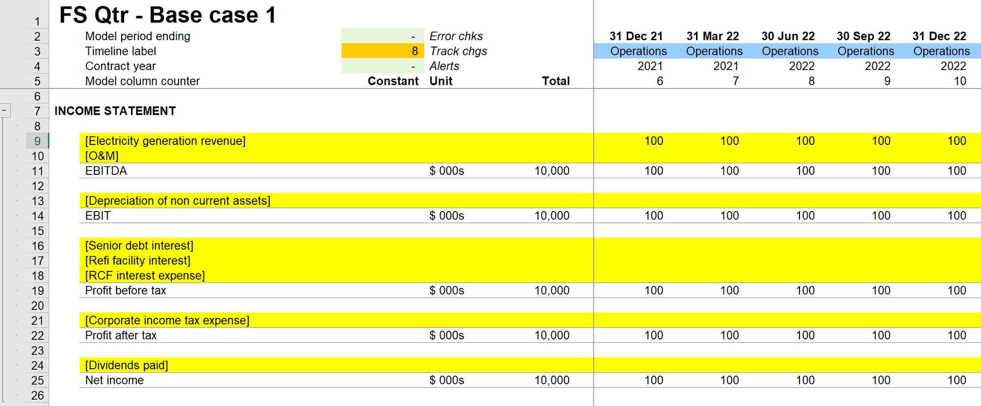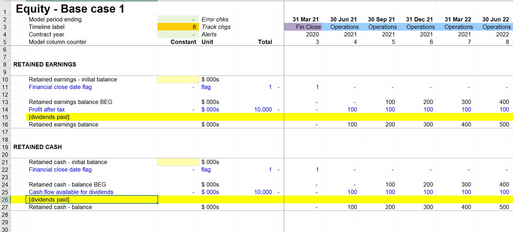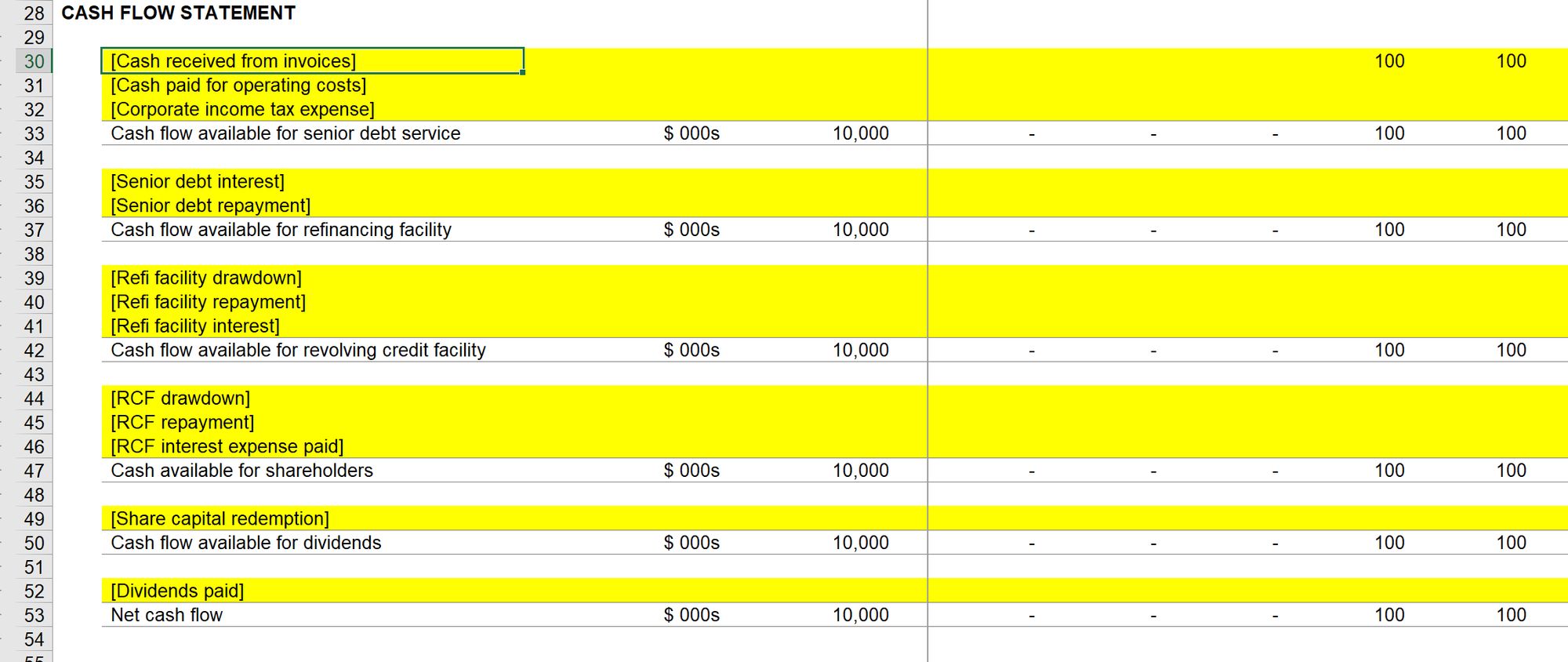Doing the same on the Cashflow statement, the 100 of "cash received" in every period drops straight to "Cashflow available for Dividend" since we have not modelled any cash outflows.