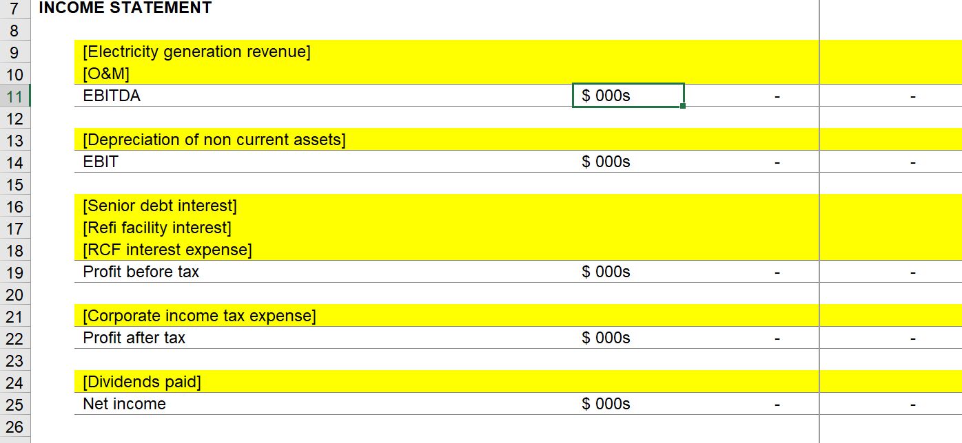 If we add the same amount of cash inflow at the top of the income statement, we can see that USD 10,000,000 also drops straight "Cashflow available for dividend" since we have not modelled any other costs at present.